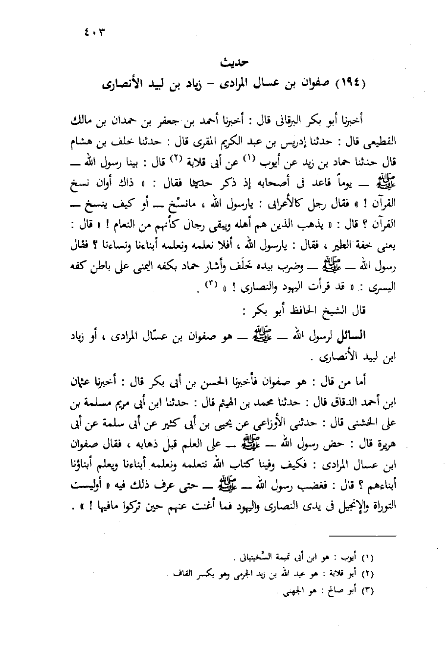 الْقَطِيعِيُّ قَالَ: حَدَّثَنَا إِدْرِيسُ بْنُ عَبْدِ الْكَرِيمِ الْمُقْرِي قَالَ: حَدَّثَنَا خَلَفُ بْنُ هِشَامٍ قَالَ حَدَّثَنَا حَمَّادُ بْنُ زَيْدٍ عَنْ أَيُّوبَ عَنْ أَبِي قِلابَةَ قَالَ: بَيْنَا رَسُولُ اللَّهِ - صَلَّى اللَّهُ عَلَيْهِ وَسَلَّم َ - يَوْمًا قَاعِدٌ فِي أَصْحَابِهِ إِذْ ذَكَرَ حَدِيثًا فَقَالَ: " ذَاكَ أَوَانُ نَسْخِ الْقُرْآنِ {" فَقَالَ رَجُلٌ كَالأَعْرَابِيِّ: يَا رَسُولَ اللَّهِ، مَا نُسِخَ - أَوْ كَيْفَ يُنْسَخُ - الْقُرْآنُ؟ قَالَ: " يَذْهَبُ الَّذِينَ هُمْ أَهْلُهُ وَيَبْقَى رِجَالٌ كَأَنَّهُمْ مِنَ النَّعَامِ} " قَالَ: يَعْنِي خِفَّةَ الطَّيْرِ، فَقَالَ: يَا رَسُولَ اللَّهِ، أَفَلا نُعَلَّمُهُ وَنُعَلِّمِهُ أَبْنَاءَنَا وَنِسَاءَنَا؟ فَقَالَ رَسُولُ اللَّهِ - صَلَّى اللَّهُ عَلَيْهِ وَسَلَّم َ - وَضَرَبَ بِيَدِهِ خَلْفَ وَأَشَارَ حَمَّادٌ بِكَفِّهِ الْيُمْنَى عَلَى بَاطِنِ كَفِّهِ الْيُسْرَى: " قَدْ قَرَأَتِ الْيَهُودُ وَالنَّصَارَى {".