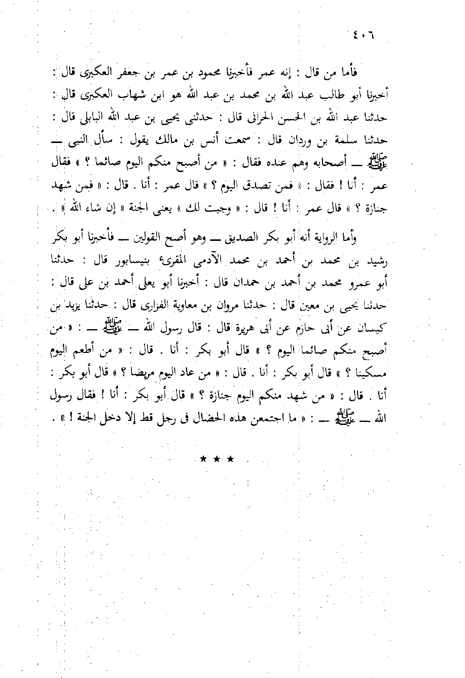 فأمَّا من قَالَ: إنه عُمَر فَأَخْبَرَنَا مَحْمُودُ بْنُ عُمَرَ بْنِ جَعْفَرٍ الْعُكْبَرِيُّ قَالَ: أَخْبَرَنَا أَبُو طَالِبٍ عَبْدُ اللَّهِ بْنُ مُحَمَّدِ بْنِ عَبْدِ اللَّهِ هُوَ ابْنُ شِهَابٍ الْعُكْبَرِيُّ قَالَ: حَدَّثَنَا عَبْدُ اللَّهِ بْنُ الْحَسَنِ الْحَرَّانِيُّ قَالَ: حَدَّثَنِي يَحْيَى بْنُ عَبْدِ اللَّهِ الْبَابِلِيُّ قَالَ: حَدَّثَنَا سَلَمَةُ بْنُ وَرْدَانَ قَالَ: سَمِعْتُ أَنَسَ بْنَ مَالِكٍ يَقُولُ: سَأَلَ النَّبِيُّ - صَلَّى اللَّهُ عَلَيْهِ وَسَلَّم َ - أَصْحَابَهُ وَهُمْ عِنْدَهُ فَقَالَ: " مَنْ أَصْبَحَ مِنْكُمُ الْيَوْمَ صَائِمًا؟ " فَقَالَ عُمَرُ: أَنَا {فَقَالَ: " فَمَنْ تَصَدَّقَ الْيَوْمَ؟ " قَالَ عُمَرُ: أَنَا. قَالَ: " فَمَنْ شَهِدَ جِنَازَةً؟ " قَالَ عُمَرُ: أَنَا} قَالَ: " وَجَبَتْ لَكَ " يَعْنِي الْجَنَّةَ " إِنْ شَاءَ اللَّهُ ".