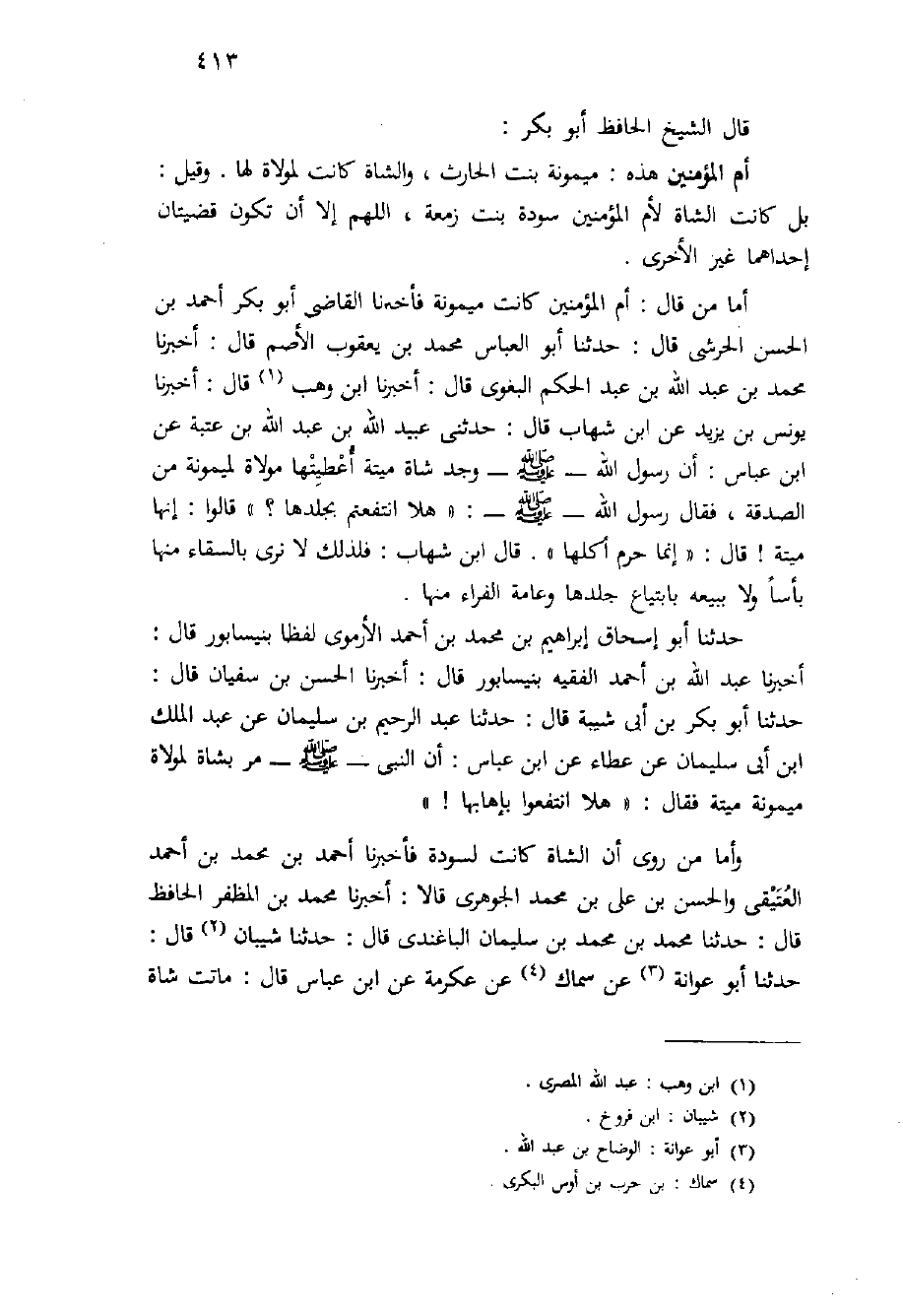 حَدَّثَنَا أَبُو إِسْحَاقَ إِبْرَاهِيمُ بْنُ مُحَمَّدِ بْنِ أَحْمَدَ الأُرْمَوِيُّ لَفْظًا بِنَيْسَابُورَ قَالَ: أَخْبَرَنَا عَبْدُ اللَّهِ بْنُ أَحْمَدَ الْفَقِيهُ بِنَيْسَابُورَ قَالَ: أَخْبَرَنَا الْحَسَنُ بْنُ سُفْيَانَ قَالَ: حَدَّثَنَا أَبُو بَكْرِ بْنُ أَبِي شَيْبَةَ قَالَ: حَدَّثَنَا عَبْدُ الرَّحِيمِ بْنُ سُلَيْمَانَ عَنْ عبد الملك ابن أَبِي سُلَيْمَانَ عَنْ عَطَاءٍ عَنِ ابْنِ عَبَّاسٍ: أَنّ النَّبِيَّ - صَلَّى اللَّهُ عَلَيْهِ وَسَلَّم َ - مَرَّ بِشَاةٍ لِمَوْلاةِ مَيْمُونَةَ مَيِّتَةً فَقَالَ: " هَلا انْتَفَعُوا بِإِهَابِهَا} "