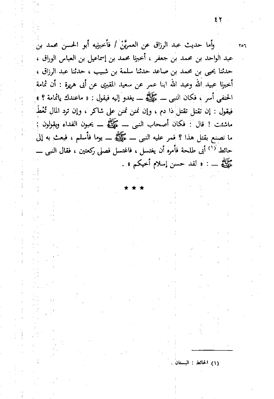 وأما حديث عَبْد الرزاق عن العمرين / فَأَخْبَرَنِيهِ أَبُو الْحَسَنِ مُحَمَّدُ بْنُ عَبْدِ الْوَاحِدِ بْنِ مُحَمَّدِ بْنِ جَعْفَرٍ، أَخْبَرَنَا مُحَمَّدُ بْنُ إِسْمَاعِيلَ بْنِ الْعَبَّاسِ الْوَرَّاقُ، حَدَّثَنَا يَحْيَى بْنُ مُحَمَّدِ بْنِ صَاعِدٍ حَدَّثَنَا سَلَمَةُ بْنُ شَبِيبٍ، حَدَّثَنَا عَبْدُ الرَّزَّاقِ، أَخْبَرَنَا عُبَيْدُ اللَّهِ وَعَبْدُ اللَّهِ ابْنَا عُمَرَ عَنْ سَعِيدٍ الْمَقْبَرِيِّ عَنْ أَبِي هُرَيْرَةَ: أَنَّ ثُمَامَةَ الْحَنَفِيَّ أُسِرَ، فَكَانَ النَّبِيِّ - صَلَّى اللَّهُ عَلَيْهِ وَسَلَّم َ - يَغْدُو إِلَيْهِ فَيَقُولُ: " مَا عِنْدَكَ يَا ثُمَامَةُ؟ " فَيَقُولُ: إِنْ تَقْتُلْ تَقْتُلْ ذَا دَمٍ، وَإِنْ تَمْنُنْ تَمْنُنْ عَلَى شَاكِرٍ، وَإِنْ تَرُدَّ الْمَالَ تُعْطَ مَا شِئْتَ! قَالَ: فَكَانَ أَصْحَابُ النَّبِيِّ - صَلَّى اللَّهُ عَلَيْهِ وَسَلَّم َ - يُحِبُّونَ الْفِدَاءَ وَيَقُولُونَ: مَا نَصْنَعُ بِقَتْلِ هَذَا؟ فَمَرَّ عَلَيْهِ النَّبِيُّ - صَلَّى اللَّهُ عَلَيْهِ وَسَلَّم َ - يوما فَأَسْلَمَ، فَبَعَثَ بِهِ إِلَى حَائِطِ أَبِي طَلْحَةَ فَأَمَرَهُ أَنْ يَغْتَسِلَ، فَاغْتَسَلَ فَصَلَّى رَكْعَتَيْنِ، فَقَالَ النَّبِيُّ - صَلَّى اللَّهُ عَلَيْهِ وَسَلَّم َ -: " لقد حسن إسلام أخيكم ".