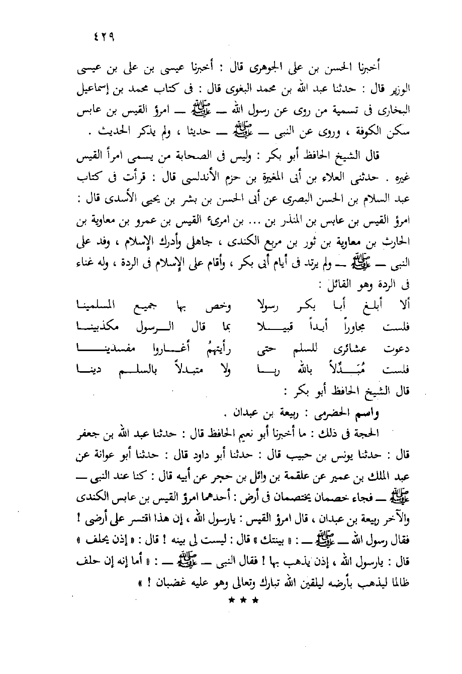 أَخْبَرَنَا الْحَسَنُ بْنُ عَلِيٍّ الْجَوْهَرِيُّ قَالَ: أَخْبَرَنَا عِيسَى بْنُ عَلِيِّ بْن عِيسَى الوزير قَالَ: حَدَّثَنَا عَبْدُ اللَّهِ بْنُ مُحَمَّدٍ الْبَغَوِيُّ قَالَ: فِي كتاب مُحَمَّد بْن إِسْمَاعِيلَ الْبُخَارِيّ فِي تسمية من روى عن رَسُول اللَّه - صَلَّى اللَّهُ عَلَيْهِ وَسَلَّم َ - امرؤ القيس بْن عابس سكن الكوفة، وروى عن النَّبِيّ - صَلَّى اللَّهُ عَلَيْهِ وَسَلَّم َ - حديثًا، ولم يذكر الحديث.