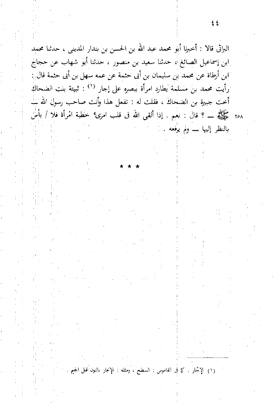 الْبَرَاثِيُّ قَالا: أَخْبَرَنَا أَبُو مُحَمَّدٍ عَبْدُ اللَّهِ بْنُ الْحَسَنِ بْنِ بندار المديني، حدثنا محمد ابن إِسْمَاعِيلَ الصَّائِغُ، حَدَّثَنَا سَعِيدُ بْنُ مَنْصُورٍ، حَدَّثَنَا أَبُو شِهَابٍ عَنْ حجاج ابن أَرْطَاةَ عَنْ مُحَمَّدِ بْنِ سُلَيْمَانَ بْنِ أَبِي حَثْمَةَ عَنْ عَمِّهِ سَهْلِ بْنِ أَبِي حَثْمَةَ قَالَ: رَأَيْتُ مُحَمَّدَ بْنَ مَسْلَمَةَ يُطَارِدُ امْرَأَةً بِبَصَرِهِ عَلَى إِجَارٍ: ثُبَيْتَةُ بِنْتُ الضَّحَّاكِ أُخْتُ جُبَيْرَةَ بْنِ الضَّحَّاكِ، فَقُلْتُ لَهُ: تَفْعَلُ هَذَا وَأَنْتَ صَاحِبُ رَسُولِ اللَّهِ - صَلَّى اللَّهُ عَلَيْهِ وَسَلَّم َ -؟ قَالَ: نَعَمْ. إِذَا أَلْقَى اللَّهُ فِي قَلْبِ امْرِئٍ خِطْبَةَ امْرَأَةٍ فَلا / بَأْسَ بِالنَّظَرِ إِلَيْهَا - وَلَمْ يرفعه.
