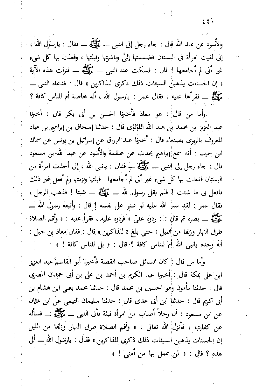 وَالأَسْوَدِ عَنْ عَبْدِ اللَّهِ قَالَ: جَاءَ رَجُلٌ إِلَى النَّبِيِّ - صَلَّى اللَّهُ عَلَيْهِ وَسَلَّم َ - فَقَالَ: يَا رَسُولَ اللَّهِ، إِنِّي لَقِيتُ امْرَأَةً فِي الْبُسْتَانِ فَضَمَمْتُهَا إِلَيَّ وَبَاشَرْتُهَا وَقَبَّلْتُهَا، وَفَعَلْتُ بِهَا كُلَّ شَيْءٍ غَيْرَ أَنِّي لَمْ أُجَامِعْهَا {قَالَ: فَسَكَتَ عَنْهُ النَّبِيُّ - صَلَّى اللَّهُ عَلَيْهِ وَسَلَّم َ - فَنَزَلَتْ هَذِهِ الآيَةُ {إِنَّ الْحَسَنَاتِ يُذْهِبْنَ السَّيِّئَاتِ ذَلِكَ ذِكْرَى لِلذَّاكِرِينَ} قَالَ: فَدَعَاهُ النَّبِيُّ - صَلَّى اللَّهُ عَلَيْهِ وَسَلَّم َ - فَقَرَأَهَا عَلَيْهِ، فَقَالَ عُمَرُ: يَا رَسُولَ اللَّهِ، أَلَهُ خَاصَّةً أَمْ لِلنَّاسِ كَافَّةً؟