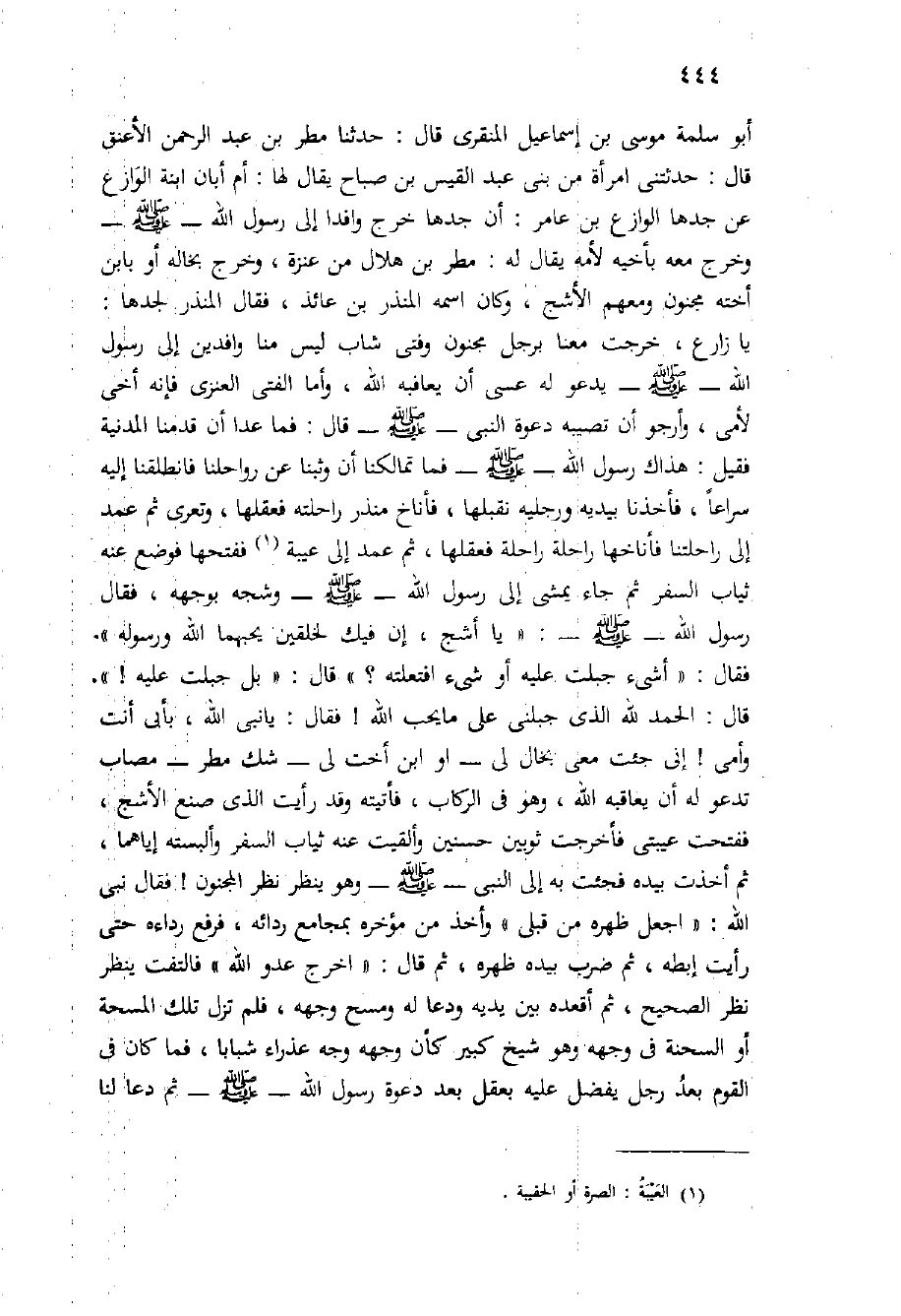 أَبُو سَلَمَةَ مُوسَى بْنُ إِسْمَاعِيلَ الْمَنْقُرِيُّ قَالَ: حَدَّثَنَا مَطَرُ بْنُ عبد الرحمن الأعنق قال: حدثتني امْرَأَةٌ مِنْ بَنِي عَبْدِ الْقَيْسِ بْنِ صَبَّاحٍ يُقَالُ لَهَا: أُمُّ أبان ابنة الوازع عن جدها الوازع بْنِ عَامِرٍ: أَنَّ جَدَّهَا خَرَجَ وَافِدًا إِلَى رَسُولِ اللَّهِ - صَلَّى اللَّهُ عَلَيْهِ وَسَلَّم َ - وَخَرَجَ مَعَهُ بِأَخِيهِ لأُمِّهِ يُقَالُ لَهُ: مَطَرُ بْنُ هِلالٍ مِنْ عَنْزَةَ، وَخَرَجَ بِخَالِهِ أَوْ بِابْنِ أُخْتِهِ مَجْنُونٍ وَمَعَهُمُ الأَشَجُّ، وَكَانَ اسْمُهُ الْمُنْذِرُ بْنُ عَائِذٍ، فَقَالَ الْمُنْذِرُ لِجَدِّهَا: يَا زَارِعُ، خَرَجْتَ مَعَنَا بِرَجُلٍ مَجْنُونٍ وَفَتًى شَابٍّ لَيْسَ مِنَّا وَافِدِينَ إِلَى رَسُولِ اللَّهِ - صَلَّى اللَّهُ عَلَيْهِ وَسَلَّم َ - يدعو له عسى أن يعافيه اللَّهُ، وَأَمَّا الْفَتَى الْعَنْزِيُّ فَإِنَّهُ أَخِي لأُمِّي، وَأَرْجُو أَنْ تُصِيبَهُ دَعْوَةَ النَّبِيِّ - صَلَّى اللَّهُ عَلَيْهِ وَسَلَّم َ - قَالَ: فَمَا عَدَا أَنْ قَدِمْنَا المدنية فَقِيلَ: هَذَاكَ رَسُولُ اللَّهِ - صَلَّى اللَّهُ عَلَيْهِ وَسَلَّم َ - فَمَا تَمَالَكْنَا أَنْ وَثَبْنَا عَنْ رواحلنا فَانْطَلَقْنَا إِلَيْهِ سِرَاعًا، فَأَخَذْنَا بِيَدَيْهِ وَرِجْلَيْهِ نُقَبِّلُهَا، فَأَنَاخَ مُنْذِرٌ رَاحِلَتَهُ فعقلها، وَتَعَرَّى ثُمَّ عَمَدَ إِلَى رَاحِلَتِنَا فأناخها راحلة راحلة فعقلها، ثُمَّ عَمَدَ إِلَى عَيْبَةٍ فَفَتَحَهَا فَوَضَعَ عَنْهُ ثِيَابَ السَّفَرِ ثُمَّ جَاءَ يَمْشِي إِلَى رَسُولِ اللَّهِ - صَلَّى اللَّهُ عَلَيْهِ وَسَلَّم َ - وَشَجُّهُ بِوَجْهِهِ، فَقَالَ رَسُولُ اللَّهِ - صَلَّى اللَّهُ عَلَيْهِ وَسَلَّم َ -: " يَا أَشَجُّ، إِنَّ فِيكَ لِخُلُقَيْنِ يُحِبُّهُمَا اللَّهُ وَرَسُولُهُ " فَقَالَ: " أَشَيْءٌ جُبِلْتُ عَلَيْهِ أَوْ شَيْءٌ افْتَعَلْتُهُ؟ " قَالَ: " بَلْ جُبِلْتَ عَلَيْهِ {". قَالَ: الْحَمْدُ للَّهِ الَّذِي جَبَلَنِي عَلَى مَا يُحِبُّ اللَّهُ} فَقَالَ: يَا نَبِيَّ اللَّهِ، بِأَبِي أَنْتَ وَأُمِّي {إِنِّي جِئْتُ مَعِي بِخَالٍ لِي - أَوِ ابْنِ أُخْتٍ لِي - شَكَّ مَطَرٌ - مُصَابٍ تَدْعُو لَهُ أَنْ يُعَاقِبَهُ اللَّه، وَهُوَ فِي الرِّكَابِ، فَأَتَيْتُهُ وَقَدْ رَأَيْتُ الَّذِي صَنَعَ الأَشَجُّ، فَفَتَحْتُ عَيْبَتِي فَأَخْرَجْتُ ثَوْبَيْنِ حَسَنَيْنِ وَأَلْقَيْتُ عَنْهُ ثِيَابَ السَّفَرِ وَأَلْبَسْتُهُ إِيَّاهُمَا، ثُمَّ أَخَذْتُ بِيَدِهِ فَجِئْتُ بِهِ إِلَى النَّبِيِّ - صَلَّى اللَّهُ عَلَيْهِ وَسَلَّم َ - وَهُوَ يَنْظُرُ نَظَرَ الْمَجْنُونِ} فَقَالَ نبي الله: " اجْعَلْ ظَهْرَهُ مِنْ قِبَلِي " وَأَخَذَ مِنْ مُؤَخِّرِهِ بِمَجَامِعِ رِدَائِهِ، فَرَفَعَ رِدَاءَهُ حَتَّى رَأَيْتُ إِبِطَهُ، ثُمَّ ضَرَبَ بِيَدِهِ ظَهْرَهُ، ثُمَّ قَالَ: " اخْرُجْ عَدُوَّ اللَّهِ " فَالْتَفْتَ يَنْظُرُ نَظَرَ الصَّحِيحِ، ثُمَّ أَقْعَدَهُ بَيْنَ يَدَيْهِ وَدَعَا لَهُ وَمَسَحَ وَجْهَهُ، فلم تزل تلك المسحة أَوِ السَّحْنَةِ فِي وَجْهِهِ وَهُوَ شَيْخٌ كَبِيرٌ كَأَنَّ وَجْهَهُ وَجْهَ عَذْرَاءَ شَبَابًا، فَمَا كَانَ فِي الْقَوْمِ بَعْدُ رَجُلٍ يَفْضُلُ عَلَيْهِ بِعَقْلٍ بَعْدَ دَعْوَةِ رَسُولِ اللَّهِ - صَلَّى اللَّهُ عَلَيْهِ وَسَلَّم َ - ثم دعا لنا