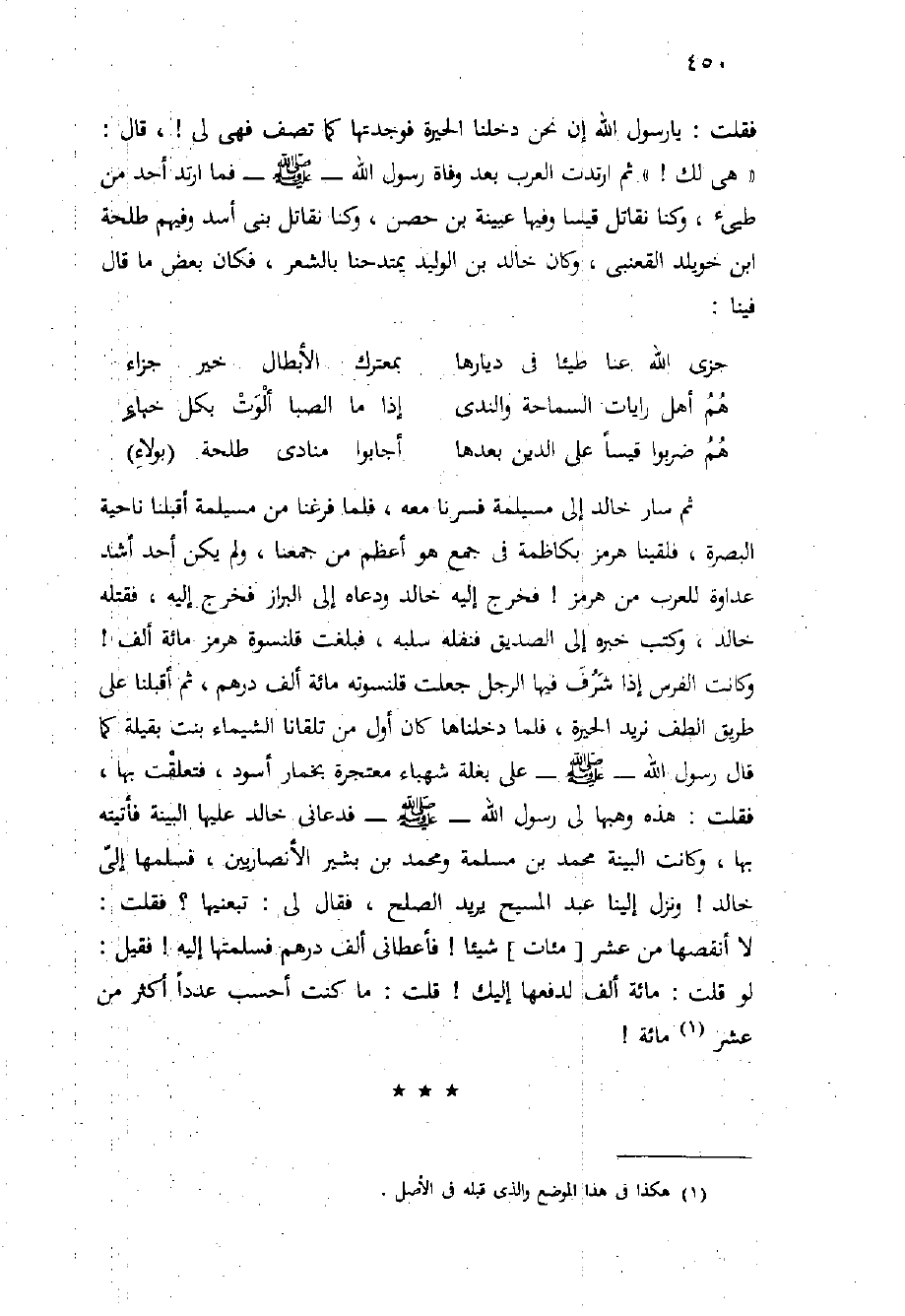ثُمَّ سَارَ خَالِدٌ إِلَى مُسَيْلِمَةَ فَسِرْنَا مَعَهُ، فَلَمَّا فَرَغْنَا مِنْ مُسَيْلِمَةَ أَقْبَلْنَا نَاحِيَةَ الْبَصْرَةِ، فَلَقِينَا هُرْمُزَ بِكَاظِمَةَ فِي جَمْعٍ هُوَ أَعْظَمُ مِنْ جَمْعِنَا، وَلَمْ يَكُنْ أَحَدٌ أَشَدُّ عَدَاوَةً لِلْعَرَبِ مِنْ هُرْمُزَ {فَخَرَجَ إِلَيْهِ خَالِدٌ وَدَعَاهُ إِلَى الْبِرَازِ فَخَرَجَ إِلَيْهِ، فَقَتَلَهُ خَالِدٌ، وَكَتَبَ خَبَرَهُ إِلَى الصِّدِّيقِ فَنَفَلَهُ سَلْبَهُ، فَبَلَغَتْ قُلُنْسُوةُ هُرْمُزَ مِائَةٍ أَلْفٍ} وَكَانَتِ الْفُرْسُ إِذَا شَرُفَ فِيهَا الرَّجُلُ جَعَلَتْ قُلُنْسُوتَهُ مِائَةَ أَلْفِ دِرْهَمٍ، ثُمَّ أَقْبَلْنَا عَلَى طَرِيقِ الطَّفِّ نُرِيدُ الْحِيرَةَ، فَلَمَّا دَخَلْنَاهَا كَانَ أَوَّلُ مَنْ تَلَقَّانَا الشيماء بنت بقيلة كَمَا قَالَ رَسُولُ اللَّهِ - صَلَّى اللَّهُ عَلَيْهِ وَسَلَّم َ - عَلَى بَغْلَةٍ شَهْبَاءَ مُعْتَجِرَةً بِخِمَارٍ أَسْوَدَ، فَتَعَلَّقْتُ بِهَا، فَقُلْتُ: هَذِهِ وَهَبَهَا لِي رَسُولُ اللَّهِ - صَلَّى اللَّهُ عَلَيْهِ وَسَلَّم َ - فَدَعَانِي خَالِدٌ عَلَيْهَا الْبَيِّنَةَ فَأَتَيْتُهُ بِهَا، وَكَانَتِ الْبَيِّنَةُ مُحَمَّدُ بْنُ مَسْلَمَةَ وَمُحَمَّدُ بْنُ بَشِيرٍ الأَنْصَارِيَّيْنِ، فَسَلَّمَهَا إِلَيَّ خَالِدٌ {وَنَزَلَ إِلَيْنَا عَبْدُ الْمَسِيحِ يُرِيدُ الصُّلْحَ، فَقَالَ لِي: تَبِعْنِيهَا؟ فَقُلْتُ: لا أَنْقُصُهَا مِنْ عَشْرِ [مِئَاتٍ] شَيْئًا} فَأَعْطَانِي أَلْفَ دِرْهَمٍ فَسَلَّمْتُهَا إِلَيْهِ {فَقِيلَ: لَوْ قُلْتَ: مِائَةَ أَلْفٍ لَدَفَعَهَا إليك} قُلْتُ: مَا كُنْتُ أَحْسَبُ عَدَدًا أكثر من عشر مائة!