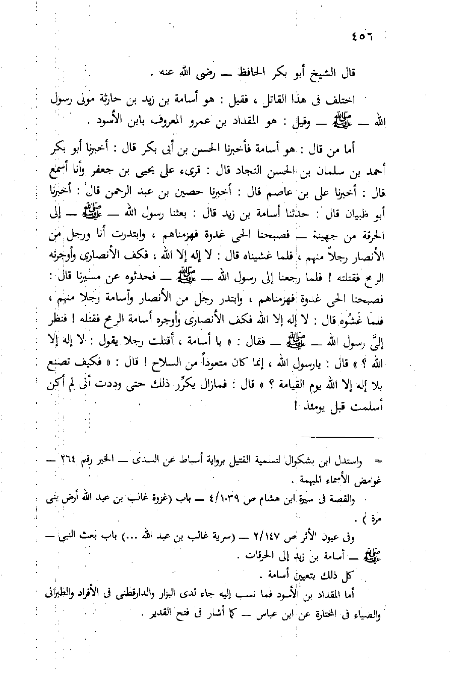 أما من قَالَ: هُوَ أسامة فَأَخْبَرَنَا الْحَسَنُ بْنُ أَبِي بَكْرٍ قَالَ: أَخْبَرَنَا أَبُو بَكْرٍ أَحْمَدُ بْنُ سَلْمَانَ بْنِ الْحَسَنِ النَّجَّادُ قَالَ: قُرِئَ عَلَى يَحْيَى بْنِ جَعْفَرٍ وَأَنَا أَسْمَعُ قَالَ: أَخْبَرَنَا عَلِيُّ بْنُ عَاصِمٍ قَالَ: أَخْبَرَنَا حُصَيْنُ بْنُ عَبْدِ الرَّحْمَنِ قَالَ: أَخْبَرَنَا أَبُو ظَبْيَانِ قَالَ: حَدَّثَنَا أُسَامَةُ بْنُ زَيْدٍ قَالَ: بَعَثَنَا رَسُولُ اللَّهِ - صَلَّى اللَّهُ عَلَيْهِ وَسَلَّم َ - إِلَى الْحَرَقَةِ مِنْ جُهَيْنَةَ - فَصَبَّحْنَا الْحَيَّ غُدْوَةً فَهَزَمْنَاهُمْ، وَابْتَدَرْتُ أَنَا وَرَجُلٌ مِنَ الأَنْصَارِ رَجُلا مِنْهُمْ، فَلَمَّا غَشَيْنَاهُ قَالَ: لا إِلَهَ إِلا اللَّهُ، فَكَفَّ الْأَنْصَارِيُّ وَأَوْجَرْتُهُ الرُّمْحَ فَقَتَلْتُهُ {فَلَمَّا رَجَعْنَا إِلَى رَسُولُ اللَّهِ - صَلَّى اللَّهُ عَلَيْهِ وَسَلَّم َ - فحدثوه عن مسيرنا قال: فصبحنا الحي غدوة فهزمناهم، وابتدر رجل من الأنصار وأسامة رجلا منهم، فلما غشوه قَالَ: لا إِلَهَ إِلا اللَّهُ فكف الأنصاري وأوجره أسامة الرمح فقتله} فَنَظَرَ إِلَى رَسُولِ اللَّهِ - صَلَّى اللَّهُ عَلَيْهِ وَسَلَّم َ - فَقَالَ: " يَا أُسَامَةُ، أَقَتَلْتَ رَجُلا يَقُولُ: لا إِلَهَ إِلا اللَّهُ؟ " قال: يا رسول الله، إنما كان متعوذا من السلاح {قال: " فكيف تصنع بلا إله إلا الله يوم القيامة؟ " قَالَ: فَمَا زَالَ يُكَرِّرُ ذَلِكَ حَتَّى وَدَدْتُ أَنِّي لَمْ أَكُنْ أسلمت قبل يومئذ}