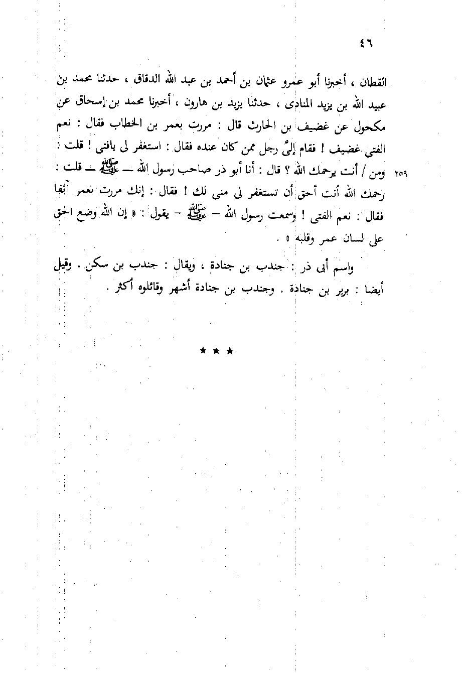 الْقَطَّانُ، أَخْبَرَنَا أَبُو عَمْرٍو عُثْمَانُ بْنُ أَحْمَدَ بْنِ عَبْدِ اللَّهِ الدَّقَّاقُ، حَدَّثَنَا مُحَمَّدُ بْنُ عُبَيْدِ اللَّهِ بْنِ يَزِيدَ الْمُنَادَى، حَدَّثَنَا يَزِيدُ بْنُ هَارُونَ، أَخْبَرَنَا مُحَمَّدُ بْنُ إِسْحَاقَ عَنْ مَكْحُولٍ عَنْ غُضَيْفِ بْنِ الْحَارِثِ قَالَ: مَرَرْتُ بِعُمَرَ بْنِ الْخَطَّابِ فَقَالَ: نِعْمَ الْفَتَى غُضَيْفٌ {فَقَامَ إِلَى رَجُلٍ مِمَّنْ كَانَ عِنْدَهُ فَقَالَ: اسْتَغْفِرْ لِي يَا فَتَى} قُلْتُ: وَمَنْ / أَنْتَ يَرْحَمُكَ اللَّهُ؟ قَالَ: أَنَا أَبُو ذَرٍّ صَاحِبُ رَسُولِ اللَّهِ - صَلَّى اللَّهُ عَلَيْهِ وَسَلَّم َ - قُلْتُ: رَحِمَكَ اللَّهُ أَنْتَ أَحَقُّ أَنْ تَسْتَغْفِرَ لِي مِنِّي لَكَ {فَقَالَ: إِنَّكَ مَرَرْتَ بِعُمَرَ آَنِفًا فَقَالَ: نِعْمَ الْفَتَى} وَسَمِعْتُ رَسُولَ اللَّهِ - صَلَّى اللَّهُ عَلَيْهِ وَسَلَّم َ - يَقُولُ: " إِنَّ اللَّهَ وَضَعَ الْحَقَّ عَلَى لِسَانِ عُمَرَ وَقَلْبِهِ ".