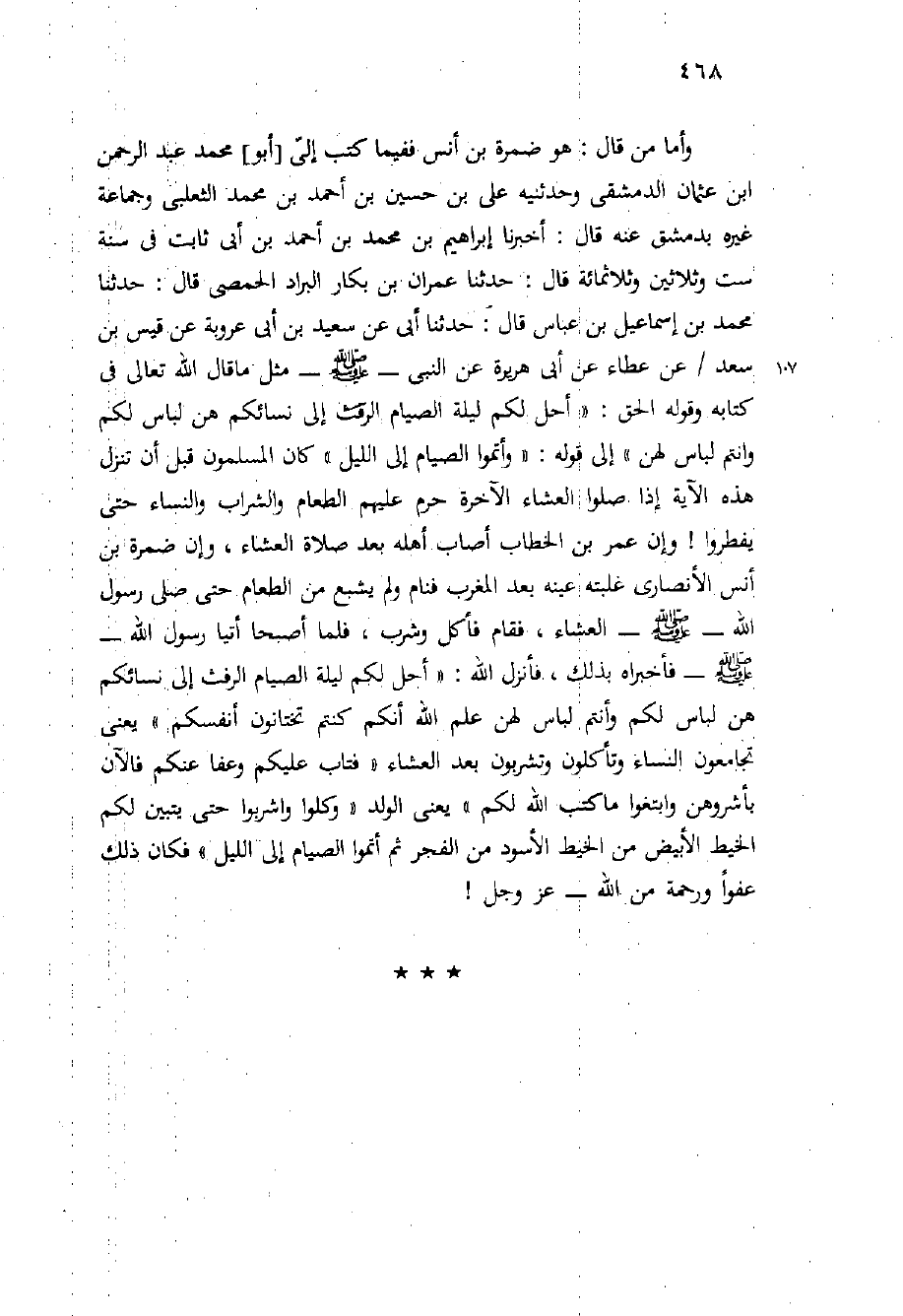 وأمَّا من قَالَ: هُوَ ضمرة بْن أنس ففيما كتب إليَّ [أبو] محمد عبد الرحمن ابن عثمان الدمشقي وحدثنيه عَلَى بْن حُسَيْن بْن أَحْمَدَ بْنِ مُحَمَّد الثعلبي وَجَمَاعَةٌ غَيْرُهُ بِدِمَشْقَ عَنْهُ قَالَ: أخبرنا إِبْرَاهِيم بْن مُحَمَّدِ بْنِ أَحْمَدَ بْن أَبِي ثابت فِي سنة ست وثلاثين وثلاثمائة قَالَ: حَدَّثَنَا عِمْرَانَ بْن بكار البراد الحمصي قَالَ: حَدَّثَنَا مُحَمَّدُ بْنُ إِسْمَاعِيلَ بْن عَبَّاس قَالَ: حَدَّثَنَا أَبِي عن سَعِيد بْن أَبِي عروبة عن قيس بْن سعد / عن عَطَاء عن أَبِي هُرَيْرَةَ عن النَّبِيّ - صَلَّى اللَّهُ عَلَيْهِ وَسَلَّم َ - مثل ما قَالَ اللَّه تَعَالى فِي كتابه وقولُه الحق: {أُحِلَّ لَكُمْ لَيْلَةَ الصِّيَامِ الرَّفَثُ إِلَى نِسَائِكُمْ هُنَّ لِبَاسٌ لَكُمْ وَأَنْتُمْ لباس لهن} إلى قوله: {وأتموا الصيام إلى الليل} كَانَ المسلمون قبل أن تنزل هَذِهِ الآية إِذَا صلوا العشاء الآخرة حرم عليهم الطعام والشراب والنساء حَتَّى يفطروا {وإن عُمَر بْن الخطاب أصاب أهله بعد صلاة العشاء، وإن ضمرة بْن أنس الْأَنْصَارِيّ غلبته عينه بعد المغرب فنام ولم يشبع من الطعام حَتَّى صلى رَسُول اللَّه - صَلَّى اللَّهُ عَلَيْهِ وَسَلَّم َ - العشاء، فقام فأكل وشرب، فلما أصبحا أتيا رَسُول اللَّه - صَلَّى اللَّهُ عَلَيْهِ وَسَلَّم َ - فأخبراه بذلك، فأنزل اللَّه: {أُحِلَّ لَكُمْ لَيْلَةَ الصِّيَامِ الرَّفَثُ إِلَى نِسَائِكُمْ هُنَّ لِبَاسٌ لَكُمْ وَأَنْتُمْ لِبَاسٌ لَهُنَّ عَلِمَ اللَّهُ أَنَّكُمْ كنتم تختانون أنفسكم} يعني تجامعون النساء وتأكلون وتشربون بعد العشاء {فَتَابَ عَلَيْكُمْ وَعَفَا عَنْكُمْ فَالآنَ بَاشِرُوهُنَّ وَابْتَغُوا مَا كتب الله لكم} يعني الولد {وَكُلُوا وَاشْرَبُوا حَتَّى يَتَبَيَّنَ لَكُمُ الْخَيْطُ الأَبْيَضُ مِنَ الْخَيْطِ الأَسْوَدِ مِنَ الْفَجْرِ ثُمَّ أتموا الصيام إلى الليل} فكان ذَلِكَ عفوًا ورحمة من الله - عز وجل}