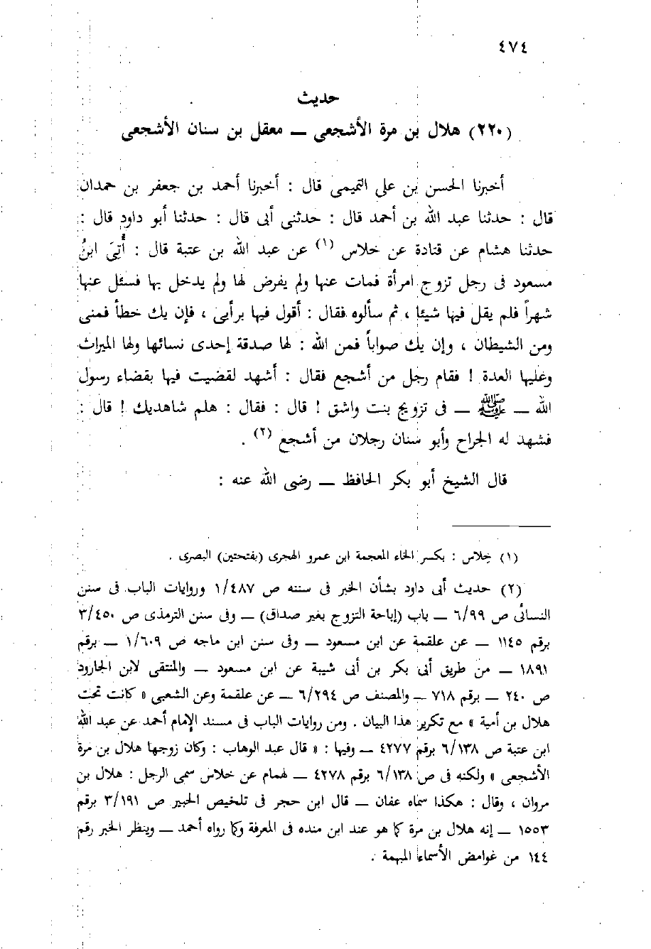 أَخْبَرَنَا الْحَسَنُ بْنُ عَلِيٍّ التَّمِيمِيُّ قَالَ: أَخْبَرَنَا أَحْمَدُ بْنُ جَعْفَرِ بْنِ حَمْدَانَ قَالَ: حَدَّثَنَا عَبْدُ اللَّهِ بْنُ أَحْمَدَ قَالَ: حَدَّثَنِي أَبِي قَالَ: حَدَّثَنَا أَبُو دَاوُدَ قَالَ: حَدَّثَنَا هِشَامٌ عَنْ قَتَادَةَ عَنْ خَلاسٍ عَنْ عَبْدِ اللَّهِ بْنِ عُتْبَةَ قَالَ: أَتَى ابْنَ مَسْعُودٍ فِي رَجُلٍ تَزَوَّجَ امْرَأَةً فَمَاتَ عَنْهَا وَلَمْ يَفْرِضْ لَهَا وَلَمْ يَدْخُلْ بِهَا فَسُئِلَ عَنْهَا شَهْرًا فَلَمْ يَقُلْ فِيهَا شَيْئًا، ثُمَّ سَأَلُوهُ فَقَالَ: أَقُولُ فِيهَا بِرَأْيِي، فَإِنْ يَكُ خَطَأً فَمِنِّي وَمِنَ الشَّيْطَانِ، وَإِنْ يَكُ صَوَابًا فَمِنَ اللَّهِ: لَهَا صَدَقَةُ إِحْدَى نِسَائِهَا وَلَهَا الْمِيرَاثُ وَعَلَيْهَا الْعِدَّةُ {فَقَامَ رَجُلٌ مِنْ أَشْجَعَ فَقَالَ: أَشْهَدُ لَقَضَيْتَ فِيهَا بِقَضَاءِ رَسُولِ اللَّهِ - صَلَّى اللَّهُ عَلَيْهِ وَسَلَّم َ - فِي تَزْوِيجِ بِنْتِ وَاشِقٍ} قَالَ: فَقَالَ: هَلُمَّ شَاهِدَيْكَ! قَالَ: فَشَهِدَ لَهُ الْجَرَّاحُ وَأَبُو سِنَانٍ رَجُلانِ مِنْ أَشْجَعَ.