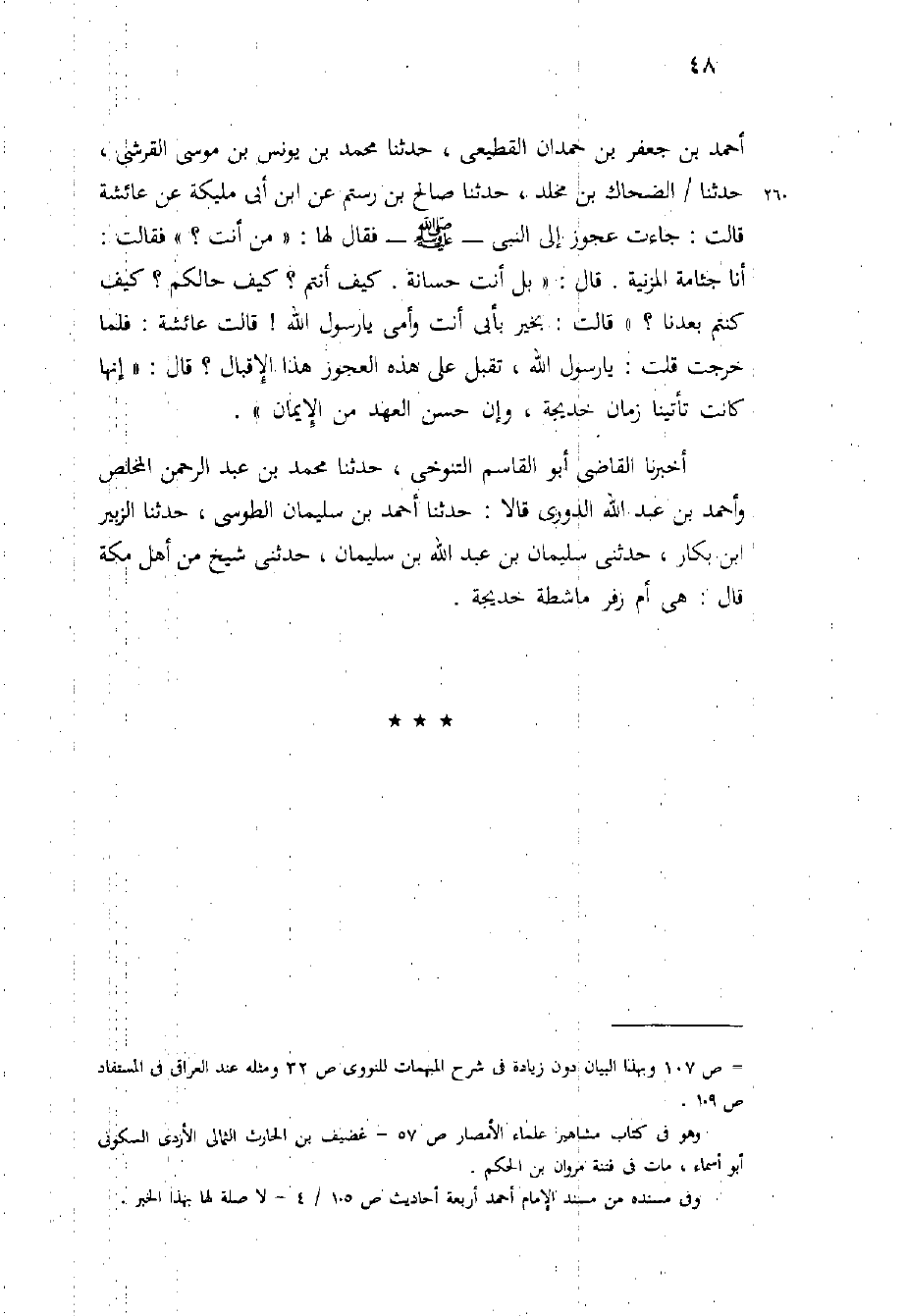 أَحْمَدُ بْنُ جَعْفَرِ بْنِ حَمْدَانَ الْقَطِيعِيُّ، حَدَّثَنَا مُحَمَّدُ بْنُ يُونُسَ بْنِ مُوسَى الْقُرَشِيُّ، حَدَّثَنَا / الضَّحَّاكُ بْنُ مَخْلَدٍ، حَدَّثَنَا صَالِحُ بْنُ رُسْتُمَ عَنِ ابْنِ أَبِِي مُلَيْكَةَ عَنْ عَائِشَةَ قَالَتْ: جَاءَتْ عَجُوزٌ إِلَى النَّبِيِّ - صَلَّى اللَّهُ عَلَيْهِ وَسَلَّم َ - فَقَالَ لَهَا: " مَنْ أَنْتِ؟ " فَقَالَتْ: أَنَا جُثَامَةُ الْمُزَنِيَّةُ. قَالَ: " بَلْ أَنْتِ حَسَّانَةُ. كَيْفَ أَنْتُمْ؟ كَيْفَ حَالُكُمْ؟ كَيْفَ كُنْتُمْ بَعْدَنَا؟ " قَالَتْ: بِخَيْرٍ بِأَبِي أَنْتَ وَأُمِّي يَا رَسُولَ اللَّهِ! قَالَتْ عَائِشَةُ: فَلَمَّا خَرَجَتْ قُلْتُ: يَا رَسُولَ اللَّهِ، تُقْبِلُ عَلَى هَذِهِ الْعَجُوزِ هَذَا الإِقْبَالَ؟ قَالَ: " إِنَّهَا كَانَتْ تَأْتِينَا زَمَانَ خَدِيجَةَ، وَإِنَّ حُسْنَ الْعَهْدِ مِنَ الإِيمَانِ ".
