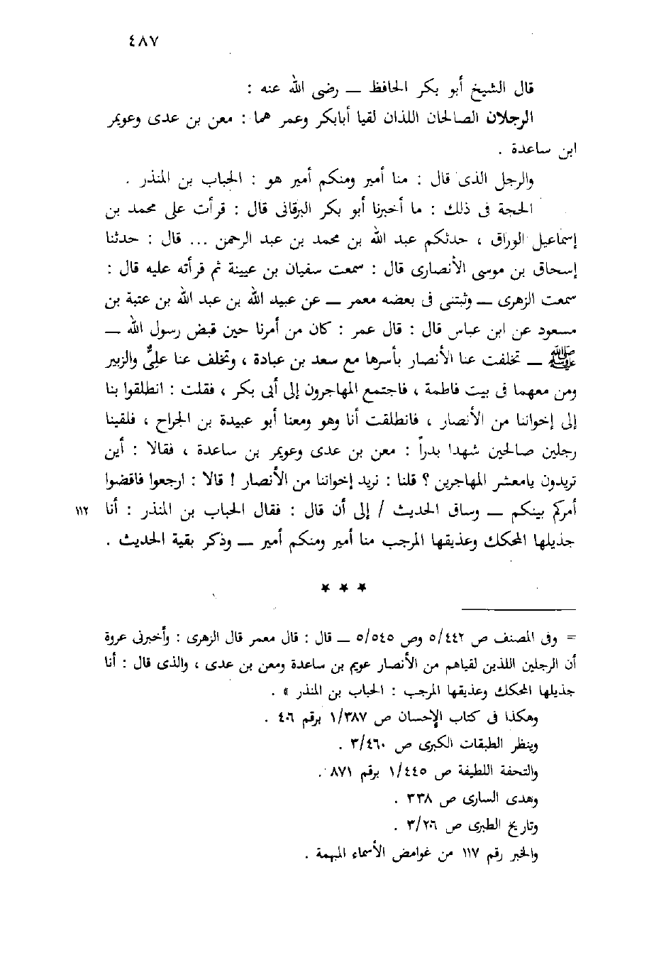 الحجة فِي ذلك: مَا أَخْبَرَنَا أَبُو بَكْرٍ الْبَرْقَانِيُّ قَالَ: قَرَأْتُ عَلَى مُحَمَّدِ بْنِ إِسْمَاعِيلَ الْوَرَّاقُ، حَدَّثَكُمْ عَبْدُ اللَّهِ بْنِ مُحَمَّدِ بْنِ عَبْدِ الرَّحْمَنِ ... قَالَ: حَدَّثَنَا إِسْحَاقُ بْنُ مُوسَى الْأَنْصَارِيُّ قَالَ: سَمِعْتُ سُفْيَانَ بْنَ عُيَيْنَةَ ثُمَّ قَرَأْتُهُ عَلَيْهِ قَالَ: سَمِعْتُ الزُّهْرِيَّ - وَثَبَّتَنِي فِي بَعْضِهِ مَعْمَرٌ - عَنْ عُبَيْدِ اللَّهِ بْنُ عَبْدِ اللَّهِ بْنِ عُتْبَةَ بْنِ مَسْعُودٍ عَنِ ابْنِ عَبَّاسٍ قَالَ: قَالَ عُمَرُ: كَانَ مِنْ أَمْرِنَا حِينَ قُبِضَ رَسُولُ اللَّهِ - صَلَّى اللَّهُ عَلَيْهِ وَسَلَّم َ - تَخَلَّفَتْ عَنَّا الأَنْصَارُ بِأَسْرِهَا مَعَ سَعْدِ بْنِ عُبَادَةَ، وَتَخَلَّفَ عَنَّا عَلِيٌّ وَالزُّبَيْرُ وَمَنْ مَعَهُمَا فِي بَيْتِ فَاطِمَةَ، فَاجْتَمَعَ الْمُهَاجِرُونَ إِلَى أَبِي بَكْرٍ، فَقُلْتُ: انْطَلِقُوا بِنَا إِلَى إِخْوَانِنَا مِنَ الأَنْصَارِ، فَانْطَلَقْتُ أَنَا وَهُوَ وَمَعَنَا أَبُو عُبَيْدَةَ بْنُ الْجَرَّاحِ، فَلَقِينَا رَجُلَيْنِ صَالِحَيْنِ شَهِدَا بَدْرًا: مَعْنُ بْنُ عَدِيٍّ وَعُوَيْمِرُ بْنُ سَاعِدَةَ، فَقَالا: أَيْنَ تُرِيدُونَ يَا مَعْشَرَ الْمُهَاجِرِينَ؟ قُلْنَا: نُرِيدُ إِخْوَانَنَا مِنَ الأَنْصَارِ! قَالا: ارْجِعُوا فَاقْضُوا أَمْرَكُمْ بَيْنَكُمْ - وَسَاقَ الْحَدِيثَ / إِلَى أَنْ قَالَ: فَقَالَ الْحُبَابُ بْنُ الْمُنْذِرِ: أَنَا جُذَيْلُهَا الْمُحَكِّكُ وَعُذَيْقُهَا الْمُرَجِّبُ مِنَّا أَمِيرٌ وَمِنْكُمْ أَمِيرٌ - وَذَكَرَ بَقْيَةَ الْحَدِيثِ.