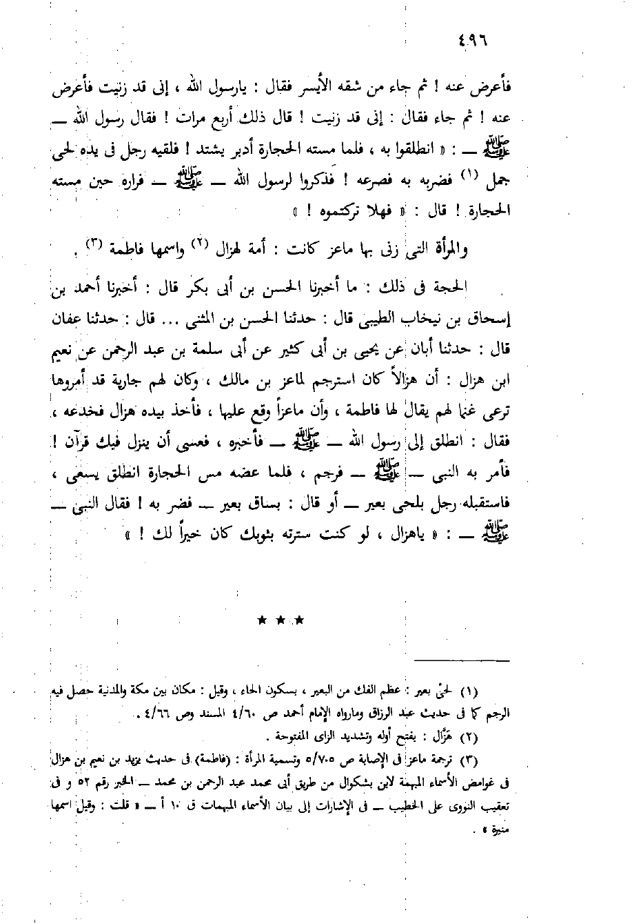 الحجة فِي ذَلِكَ: مَا أَخْبَرَنَا الْحَسَنُ بْنُ أَبِي بَكْرٍ قَالَ: أَخْبَرَنَا أَحْمَدُ بْنُ إِسْحَاقَ بْنِ نيخاب الطَّيْبِيُّ قَالَ: حَدَّثَنَا الْحَسَنُ بْنُ الْمُثَنَّى ... قَالَ: حَدَّثَنَا عَفَّانُ قَالَ: حَدَّثَنَا أَبَانٌ عَنْ يَحْيَى بْنِ أَبِي كَثِيرٍ عَنْ أَبِي سَلَمَةَ بْنِ عَبْدِ الرحمن عن نعيم ابن هَزَّالٍ: أَنَّ هَزَّالًا كَانَ اسْتَرْجَمَ لِمَاعِزِ بْنِ مَالِكٍ، وَكَانَ لَهُمْ جَارِيَةٌ قَدْ أَمَرُوهَا تَرْعَى غَنَمًا لَهُمْ يُقَالُ لَهَا فَاطِمَةُ، وَأَنَّ مَاعِزًا وَقَعَ عَلَيْهَا، فَأَخَذَ بِيَدِهِ هَزَّالٌ فَخَدَعَهُ، فَقَالَ: انْطَلِقْ إِلَى رَسُولُ اللَّهِ - صَلَّى اللَّهُ عَلَيْهِ وَسَلَّم َ - فَأَخْبِرْهُ، فَعَسَى أَنْ يَنْزِلَ فِيكَ قُرْآنٌ {فَأَمَرَ بِهِ النَّبِيُّ - صَلَّى اللَّهُ عَلَيْهِ وَسَلَّم َ - فَرُجِمَ، فَلَمَّا عَضَّهُ مَسُّ الْحِجَارَةِ انْطَلَقَ يَسْعَى، فَاسْتَقَبَلَهُ رَجُلٌ بِلَحْيِ بَعِيرٍ - أَوْ قَالَ: بِسَاقِ بَعِيرٍ - فضربه} فَقَالَ النَّبِيُّ - صَلَّى اللَّهُ عَلَيْهِ وَسَلَّم َ -: " يَا هَزَّالُ، لَوْ كُنْتَ سَتَرْتَهُ بثوبك كان خيرا لك! ".
