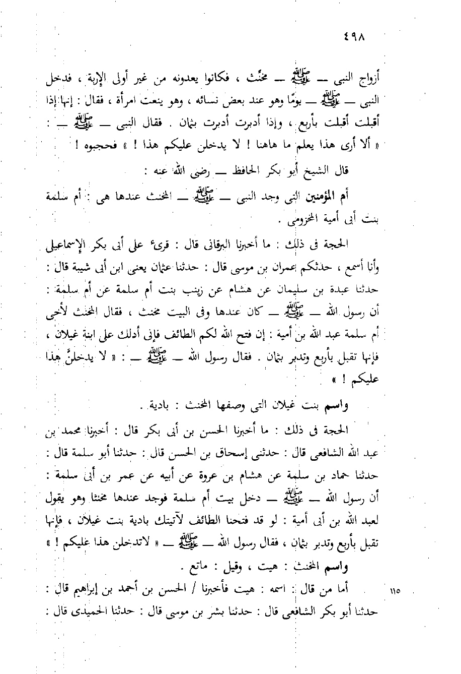 الحجة فِي ذَلِكَ: مَا أَخْبَرَنَا الْحَسَنُ بْنُ أَبِي بَكْرٍ قَالَ: أَخْبَرَنَا مُحَمَّدُ بْنُ عَبْدِ اللَّهِ الشَّافِعِيُّ قَالَ: حَدَّثَنِي إِسْحَاقُ بْنُ الْحَسَنِ قَالَ: حَدَّثَنَا أَبُو سَلَمَةَ قَالَ: حَدَّثَنَا حَمَّادُ بْنُ سَلَمَةَ عَنْ هِشَامِ بْنِ عُرْوَةَ عَنْ أَبِيهِ عَنْ عُمَرَ بْنِ أَبِي سَلَمَةَ: أَنَّ رَسُولَ اللَّهِ - صَلَّى اللَّهُ عَلَيْهِ وَسَلَّم َ - دَخَلَ بَيْتَ أُمِّ سَلَمَةَ فَوَجَدَ عِنْدَهَا مُخَنَّثًا وَهُوَ يَقُولُ لِعَبْدِ اللَّهِ بْنِ أَبِي أُمَيَّةَ: لَوْ قَدْ فَتَحْنَا الطَّائِفَ لآتَيْتُكَ بَادِيَةَ بِنْتُ غَيْلانَ، فَإِنَّهَا تُقْبِلُ بِأَرْبَعٍ وَتُدْبِرُ بِثَمَانٍ، فَقَالَ رَسُولُ اللَّهِ - صَلَّى اللَّهُ عَلَيْهِ وَسَلَّم َ - " لا تَدْخُلَنَّ هَذَا عَلَيْكُمْ! "