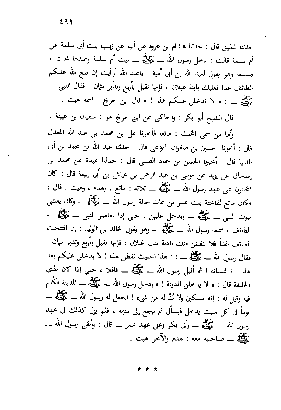حَدَّثَنَا شَقِيقٌ قَالَ: حَدَّثَنَا هِشَامُ بْنِ عُرْوَةَ عَنْ أَبِيهِ عَنْ زَيْنَبَ بِنْتِ أَبِي سَلَمَةَ عَنْ أُمِّ سَلَمَةَ قَالَتْ: دَخَلَ رَسُولُ اللَّهِ - صَلَّى اللَّهُ عَلَيْهِ وَسَلَّم َ - بَيْتَ أُمِّ سَلَمَةَ وَعِنْدَهَا مُخَنَّثٌ، فَسَمِعَهُ وَهُوَ يَقُولُ لِعَبْدِ اللَّهِ بْنِ أَبِي أُمَيَّةَ: يَا عَبْدَ اللَّهِ أَرَأَيْتَ إِنْ فَتَحَ اللَّهُ عَلَيْكُمُ الطَّائِفَ غَدًا فَعَلَيْكَ بِابْنَةِ غَيْلانَ، فَإِنَّهَا تُقْبِلُ بِأَرْبَعٍ وَتُدْبِرُ بثمان. فقال النبي -: " لا تدخلن عَلَيْكُمْ هَذَا {" قَالَ ابْنُ جريج: اسمه هيت.