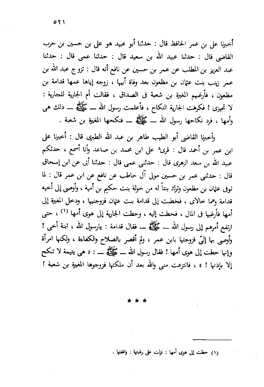 وَأَخْبَرَنَا الْقَاضِي أَبُو الطَّيِّبِ طَاهِرُ بْنُ عَبْدِ اللَّهِ الطَّبَرِيُّ قَالَ: أَخْبَرَنَا علي ابن عُمَرَ بْنِ أَحْمَدَ قَالَ: قُرِئَ عَلَى ابْنِ مُحَمَّدِ بْنِ صَاعِدٍ وَأَنَا أَسْمَعُ، حَدَّثَكُمْ عُبَيْدُ اللَّهِ بْنُ سَعْدٍ الزُّهْرِيُّ قَالَ: حَدَّثَنِي عَمِّي قَالَ: حَدَّثَنَا أَبِي عَنِ ابْنِ إِسْحَاقَ قَالَ: حَدَّثَنِي عُمَرُ بْنُ حُسَيْنٍ مَوْلَى آلِ حَاطِبٍ عَنْ نَافِعٍ عَنِ ابْنِ عُمَرَ قَالَ: لَمَّا تُوُفِّيَ عُثْمَانُ بْنُ مَظْعُونٍ وَتَرَكَ بِنْتًا لَهُ مِنْ خولة بِنْت حكيم بْن أُمَيَّة، وَأَوْصَى إِلَى أَخِيهِ قُدَامَةَ وَهُمَا خَالاي، فَخَطَبْتُ إِلَى قُدَامَةَ بِنْتَ عُثْمَانَ فَزَوَّجْنِيهَا، وَدَخَلَ الْمُغِيرَةُ إِلَى أُمِّهَا فَأَرْغَبَهَا فِي الْمَالِ، فَحَطَّتْ إِلَيْهِ، وَحَطَّتِ الْجَارِيَةُ إِلَى هَوَى أُمِّهَا، حَتَّى ارْتَفَعَ أَمْرُهُمْ إِلَى رَسُولُ اللَّهِ - صَلَّى اللَّهُ عَلَيْهِ وَسَلَّم َ - فَقَالَ قُدَامَةُ: يَا رَسُولَ اللَّهِ، ابْنَةُ أَخِي} وَأَوْصَى بِهَا إِلَيَّ فَزَوَّجْتُهَا بِابْنِ عُمَرَ، وَلَمْ أُقَصِّرْ بِالصَّلاحِ وَالْكَفَاءَةِ، وَلَكِنَّهَا امْرَأَةٌ وَإِنَّهَا حَطَّتْ إِلَى هَوَى أُمِّهَا {فَقَالَ رَسُولُ اللَّهِ - صَلَّى اللَّهُ عَلَيْهِ وَسَلَّم َ -: " هِيَ يَتِيمَةٌ لا تُنْكَحُ إِلا بِإِذْنِهَا} "، فَانْتُزِعَتْ مِنِّي وَاللَّهِ بَعْدَ أَنْ مَلَكْتُهَا فَزَوَّجُوهَا الْمُغِيرَةَ بْنَ شعبة!