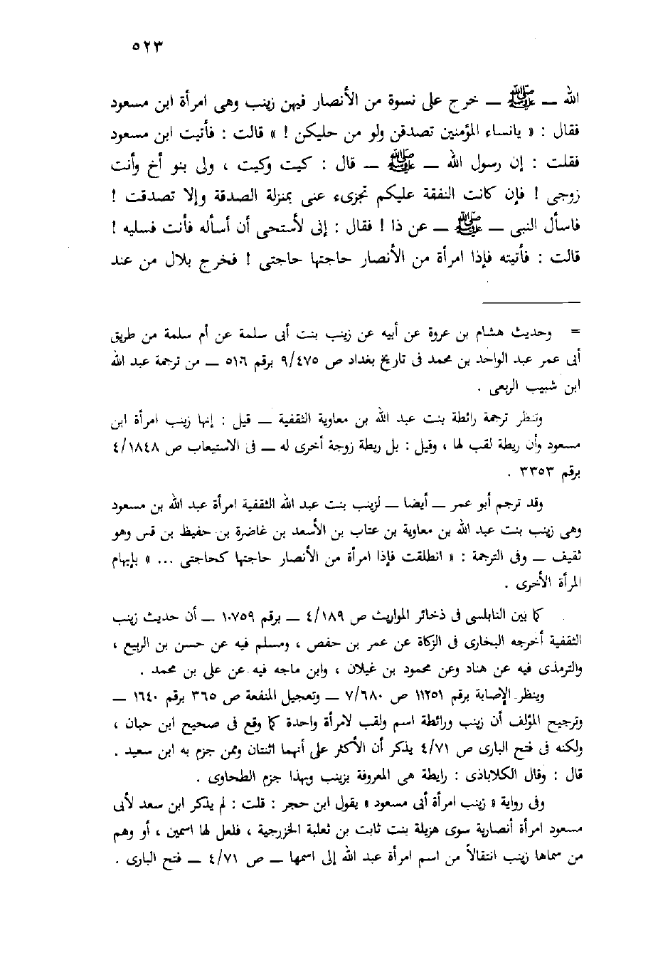 اللَّهِ - صَلَّى اللَّهُ عَلَيْهِ وَسَلَّم َ - خَرَجَ عَلَى نِسْوَةٍ مِنَ الأَنْصَارِ فِيهِنَّ زَيْنَبُ وَهِيَ امْرَأَةُ ابْنِ مَسْعُودٍ فَقَالَ: " يَا نِسَاءَ الْمُؤْمِنِينَ تَصَدَّقْنَ وَلَوْ مِنْ حُلِيِّكُنَّ {" قَالَتْ: فَأَتَيْتُ ابْنَ مَسْعُودٍ فَقُلْتُ: إِنَّ رَسُولُ اللَّهِ - صَلَّى اللَّهُ عَلَيْهِ وَسَلَّم َ - قَالَ: كَيْتَ وَكَيْتَ، وَلِي بَنُو أَخٍ وَأَنْتَ زَوْجِي} فَإِنْ كَانَتِ النَّفَقَةُ عَلَيْكُمْ تُجْزِئُ عَنِّي بِمَنْزِلَةِ الصَّدَقَةِ وَإِلا تَصَدَّقْتُ {فَاسْأَلِ النَّبِيَّ - صَلَّى اللَّهُ عَلَيْهِ وَسَلَّم َ - عَنْ ذَا} فَقَالَ: إِنِّي لأَسْتَحِي أَنْ أَسْأَلَهُ فَأَنْتِ فَسَلِيهِ {قَالَتْ: فَأَتَيْتُهُ فَإِذَا امْرَأَةٌ مِنَ الأَنْصَارِ حَاجَتُهَا حَاجَتِي} فَخَرَجَ بِلالٌ مِنْ عند