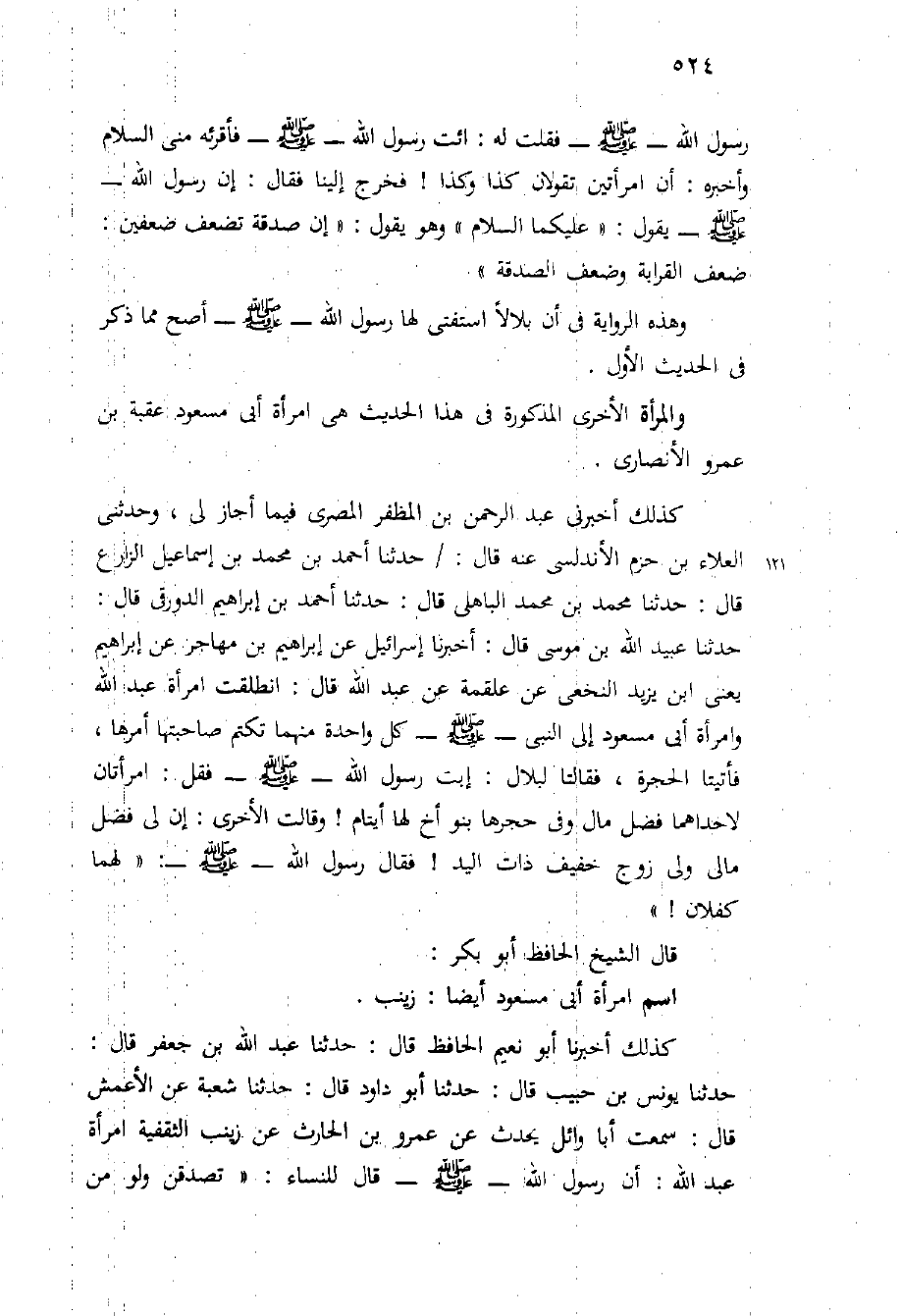 رَسُولُ اللَّهِ - صَلَّى اللَّهُ عَلَيْهِ وَسَلَّم َ - فَقَلْتُ لَهُ: ائْتِ رَسُولَ اللَّهِ - صَلَّى اللَّهُ عَلَيْهِ وَسَلَّم َ - فَأَقْرِئْهُ مِنِّي السَّلامَ وَأَخْبِرْهُ: أَنَّ امْرَأَتَيْنِ تَقُولانِ كَذَا وَكَذَا {فَخَرَجَ إِلَيْنَا فَقَالَ: إِنَّ رَسُولَ اللَّهِ - صَلَّى اللَّهُ عَلَيْهِ وَسَلَّم َ - يَقُولُ: " عَلَيْكُمَا السَّلامُ " وَهُوَ يَقُولُ: " إِنَّ صَدَقَةً تُضَعَّفُ ضِعْفَيْنِ: ضِعْفَ الْقَرَابَةِ وَضِعْفَ الصَّدَقَةِ ".
