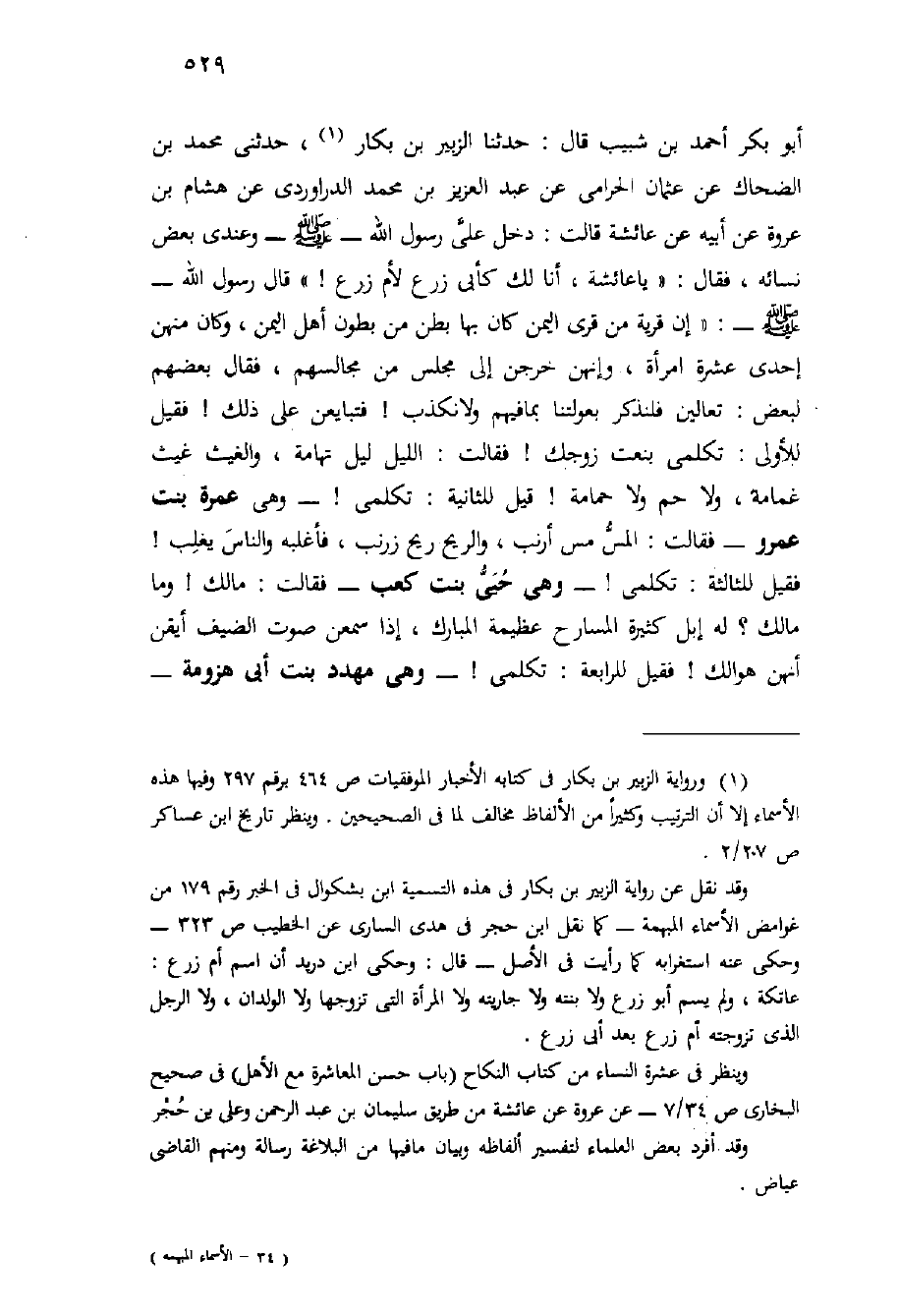 أَبُو بَكْرٍ أَحْمَدُ بْنُ شبيب قَالَ: حَدَّثَنَا الزُبَيْر بْن بكار، حدثني محمد بن الضحاك عن عثمان الحرامي عن عَبْدِ العزيز بْن مُحَمَّد الدراوردي عن هشام بْنِ عُرْوَةَ عَنْ أَبِيهِ عَنْ عَائِشَة قَالَتْ: دخل عليّ رَسُول اللَّهِ - صَلَّى اللَّهُ عَلَيْهِ وَسَلَّم َ - وعندي بعض نسائه، فَقَالَ: " يا عَائِشَة، أَنَا لَكَ كأبي زرع لأم زرع {" قَالَ رَسُول اللَّه - صَلَّى اللَّهُ عَلَيْهِ وَسَلَّم َ -: " إن قرية من قرى اليمن كَانَ بها بطن من بطون أهل اليمن، وكان منهن إحدى عشرة امرأة، وإنهن خرجن إلى مجلس من مجالسهم، فَقَالَ بعضهم لبعض: تعالين فلنذكر بعولتنا بما فيهم ولا نكذب} فتبايعن عَلَى ذَلِكَ {فقيل للأولى: تكلمي بنعت زوجك} فَقَالَتْ: الليل ليل تهامة، والغيث غيث غمامة، ولا حم ولا حمامة {قيل للثانية: تكلمي} - وهي عمرة بنت عمرة - فَقَالَتْ: المس مس أرنب، والريح ريح زرنب، فأغلبه والناس يغلب {فقيل للثالثة: تكلمي} - وهي حيي بنت كعب - فقالت: ما لك {وما مَالِك؟ لَهُ إبل كثيرة المسارح عظيمة المبارك، إِذَا سمعن صوت الضيف أيقن أنهن هوالك} فقيل للرابعة: تكلمي! - وهي مهدد بِنْت أَبِي هزومة -