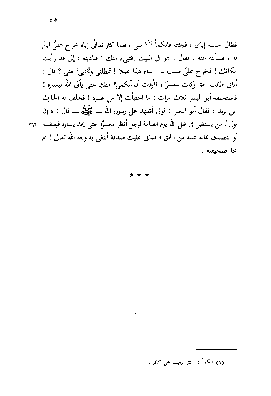 فَطَالَ حَبْسُهُ إِيَّايَ، فَجِئْتُهُ فَانْكَمَأَ مِنِّي، فَلَمَّا كَثُرَ نِدَائِي إِيَّاهُ خَرَجَ عَلِيَّ ابْنٌ لَهُ، فَسَأَلْتُهُ عَنْهُ، فَقَالَ: هُوَ فِي الْبَيْتِ يَخْتَبِئُ مِنْكَ {فَنَادَيْتُهُ: إِنِّي قَدْ رَأَيْتُ مَكَانَكَ} فَخَرَجَ عَلَيَّ فَقُلْتُ له: ساء هذا عملا {تمطلني وَتَخْتَبِئُ مِنِّي؟ قَالَ: أَتَانِي طَالِبُ حَقٍّ وَكُنْتُ مُعْسِرًا، فَأَرَدْتُ أَنْ أَنْكَمِئَ مِنْكَ حَتَّى يَأْتِيَ اللَّهُ بِيَسَارِهِ} فَاسْتَحْلَفَهُ أَبُو الْيُسْرِ ثَلاثَ مَرَّاتٍ: مَا اخْتَبَأْتَ إِلا مِنْ عسرة {فحلف له الحارث ابن يَزِيدَ، فَقَالَ أَبُو الْيُسْرِ: فَإِنِّي أَشْهَدُ عَلَى رَسُولِ اللَّهِ - صَلَّى اللَّهُ عَلَيْهِ وَسَلَّم َ - قَالَ: " إِنَّ أَوَّلَ / مَنْ يَسْتَظِلُّ فِي ظِلِّ اللَّهِ يَوْمَ الْقِيَامَةِ لَرَجُلٌ أَنْظَرَ مُعْسِرًا حَتَّى يَجِدَ يَسَارَهُ فَيَقْضِيَهُ أَوْ يَتَصَدَّقُ بِمَالِهِ عَلَيْهِ مِنَ الْحَقِّ " فَمَالِي عَلَيْكَ صَدَقَةٌ أَبْتَغِي بِهِ وَجْهَ اللَّهِ تعالى} ثم محا صحيفته.