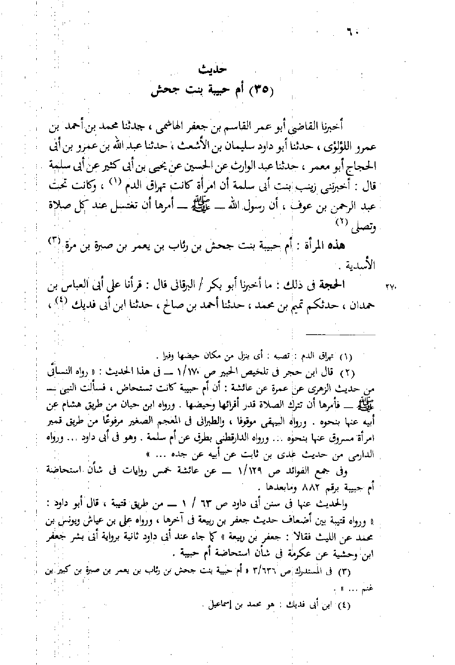 أَخْبَرَنَا الْقَاضِي أَبُو عُمَرَ الْقَاسِمُ بْنُ جَعْفَرِ الْهَاشِمِيُّ، حَدَّثَنَا مُحَمَّدُ بْنُ أَحْمَدَ بْنِ عَمْرٍو اللُّؤْلُؤِيُّ، حَدَّثَنَا أَبُو دَاوُدَ سُلَيْمَانُ بْنُ الأَشْعَثِ، حَدَّثَنَا عَبْدُ اللَّهِ بْنُ عَمْرِو بْنِ أَبِي الْحَجَّاجِ أَبُو مَعْمَرٍ، حَدَّثَنَا عَبْدُ الْوَارِثِ عَنِ الْحُسَيْنِ عَنْ يَحْيَى بْنِ أَبِي كَثِيرٍ عَنْ أَبِي سَلَمَةَ قَالَ: أَخْبَرَتْنِي زَيْنَبُ بِنْتُ أَبِي سَلَمَةَ أَنَّ امْرَأَةً كَانَتْ تُهْرَاقُ الدَّمَ، وَكَانَتْ تَحْتَ عَبْدِ الرَّحْمَنِ بْنِ عَوْفٍ، أَنَّ رَسُولُ اللَّهِ - صَلَّى اللَّهُ عَلَيْهِ وَسَلَّم َ - أَمَرَهَا أَنْ تَغْتَسِلَ عِنْدَ كُلِّ صَلاةٍ وَتُصَلِّي.