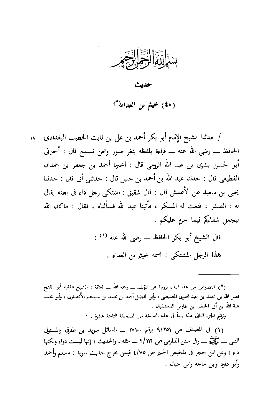 / حَدَّثَنَا الشَّيْخُ الإِمَامُ أَبُو بَكْرٍ أَحْمَدُ بْنُ عَلِيِّ بْنِ ثَابِتٍ الْخَطِيبُ الْبَغْدَادِيُّ الْحَافِظُ - رَضِيَ اللَّهُ عَنْهُ - قِرَاءَةً بِلَفْظِهِ بِثَغْرِ صُورٍ وَنَحْنُ نَسْمَعُ قَالَ: أَخْبَرَنِي أَبُو الْحَسَنِ بُشْرَى بْنُ عَبْدِ اللَّهِ الرُّومِيُّ قَالَ: أَخْبَرَنَا أَحْمَدُ بْنُ جَعْفَرِ بْنِ حَمْدَانَ الْقَطِيعِيُّ قَالَ: حَدَّثَنَا عَبْدُ اللَّهِ بْنُ أَحْمَدَ بْنِ حَنْبَلٍ قَالَ: حَدَّثَنِي أَبِي قَالَ: حَدَّثَنَا يَحْيَى بْنُ سَعِيدٍ عَنِ الأَعْمَشِ قَالَ: قَالَ شَقِيقٌ: اشْتَكَي رَجُلٌ دَاءً فِِي بَطْنِهِ يُقَالُ لَهُ: الصَّفَرُ، فَنُعِتَ لَهُ الْمُسْكِرُ، فَأَتَيْنَا عَبْدَ اللَّهِ فَسَأَلْنَاهُ، فَقَالَ: مَا كَانَ اللَّهُ لِيَجْعَلَ شِفَاءَكُمْ فِيمَا حَرَّمَ عَلَيْكُمْ.