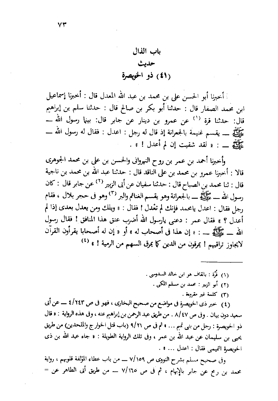 وَأَخْبَرَنَا أَحْمَدُ بْنُ عُمَرَ بْنِ رَوْحٍ النَّهْرَوَانِيُّ وَالْحَسَنُ بْنُ عَلِيِّ بْنِ مُحَمَّدٍ الْجَوْهَرِيُّ قَالا: أَخْبَرَنَا عَمْرُو بْنُ مُحَمَّدِ بْنِ عَلِيٍّ النَّاقِدُ قَالَ: حَدَّثَنَا عَبْدُ اللَّهِ بْنُ مُحَمَّدِ بْنِ نَاجِيَةَ قَالَ: ثنا مُحَمَّدُ بْنُ الصَّبَّاحِ قَالَ: حدثنا سفيان عَنْ أَبِي الزُّبَيْرِ عَنْ جَابِرٍ قَالَ: كَانَ رَسُولُ اللَّهِ - صَلَّى اللَّهُ عَلَيْهِ وَسَلَّم َ - بِالْجِعْرَانَةِ وَهُوَ يُقَسِّمُ الْغَنَائِِمَ وَالْبُرَّ وَهُوَ فِي حِجْرِ بِلالٍ، فَقَامَ رَجُلٌ فَقَالَ: اعْدِلْ يَا مُحَمَّدُ فَإِنَّكَ لَمْ تَعْدِلْ} فَقَالَ: " وَيْلَكَ وَمَنْ يَعْدِلُ بَعْدِي إِذَا لَمْ أَعْدِلْ؟ " فَقَالَ عُمَرُ: دَعْنِي يَا رَسُولَ اللَّهِ أَضْرِبُ عُنُقَ هَذَا الْمُنَافِقِ {فَقَالَ رَسُولُ اللَّهِ - صَلَّى اللَّهُ عَلَيْهِ وَسَلَّم َ -: " إِنَّ هَذَا فِي أَصْحَابٍ لَهُ " أَوْ " إِنَّ لَهُ أَصْحَابًا يَقْرَأُونَ الْقُرْآَنَ لا يُجَاوِزُ تَرَاقِيَهُمْ} يَمْرُقُونَ مِنَ الدِّينِ كَمَا يَمْرُقُ السَّهْمُ من الرمية! "