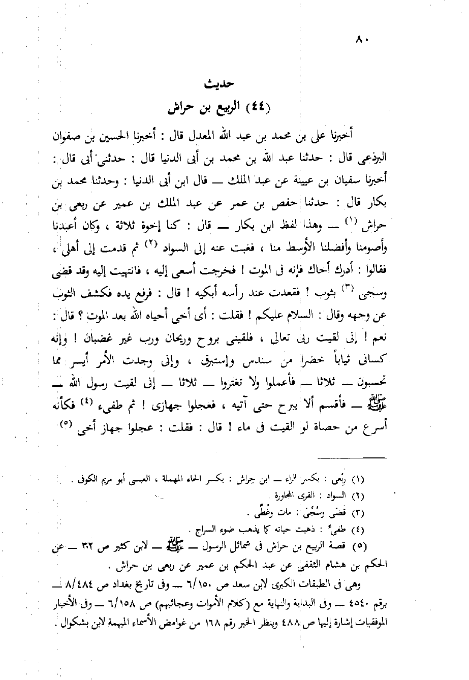 أَخْبَرَنَا عَلِيّ بْن مُحَمَّدِ بْنِ عَبْدِ اللَّهِ الْمُعَدَّل قَالَ: أَخْبَرَنَا الْحُسَيْنُ بْن صَفْوَان الْبَرْذَعِيُّ قَالَ: حَدَّثَنَا عَبْدُ اللَّهِ بْنُ مُحَمَّدِ بْنِ أَبِي الدُّنْيَا قال: حدثني أَبِي قَالَ: أَخْبَرَنَا سُفْيَان بْن عيينة عن عَبْدِ الملك - قَالَ ابن أَبِي الدُّنْيَا: وحدثنا مُحَمَّد بْن بكار قَالَ: حَدَّثَنَا حَفْص بْن عُمَرَ عن عَبْدِ الملك بْن عمير عن ربعي بْن حراش - وهذا لفظ ابن بكار - قَالَ: كُنَّا إخوة ثلاثة، وكان أعبدنا وأصومنا وأفضلنا الأوسط مِنَّا، فغبت عَنْهُ إِلَى السواد ثُمَّ قدمت إِلَى أهلي، فقالوا: أدرك أخاك فإنه فِي الموت {فخرجت أسعى إليه، فانتهيت إليه وقد قضى وسجى بثوب} فقعدت عند رأسه أبكيه {قَالَ: فرفع يده فكشف الثوب عن وجهه وقال: السلام عليكم} فقلت: أي أخي أحياه اللَّه بعد الموت؟ قَالَ: نعم {إني لقيت ربي تعالى، فلقيني بروح وريحان ورب غير غضبان} وَإِنَّهُ كساني ثيابًا خضرا من سندس وإستبرق، وإني وجدت الأمر أيسر مما تحسبون - ثلاثا - فأعملوا ولا تغتروا - ثلاثا - إني لقيت رَسُول اللَّهِ - صَلَّى اللَّهُ عَلَيْهِ وَسَلَّم َ - فأقسم ألا يبرح حَتَّى آتيه، فعجلوا جهازي {ثُمَّ طفئ فكأنه أسرع من حصاة لو ألقيت فِي ماء} قَالَ: فقلت: عجلوا جهاز أخي.