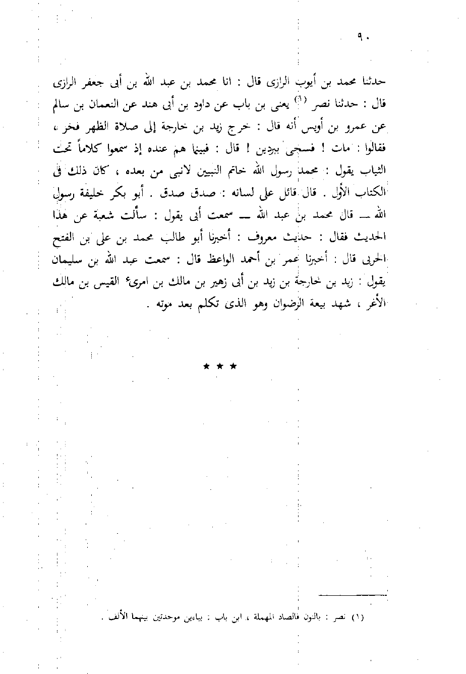 حَدَّثَنَا مُحَمَّدُ بْنُ أَيُّوبَ الرَّازِيُّ قَالَ: أَنَا مُحَمَّدُ بْنُ عَبْدِ اللَّهِ بْنِ أَبِي جَعْفَرٍ الرَّازِيُّ قَالَ: حَدَّثَنَا نَصْرٌ يَعْنِي ابْنَ بَابٍ عَنْ دَاوُدَ بْنِ أَبِي هِنْدٍ عَنِ النُّعْمَانِ بْنِ سَالِمٍ عَنْ عَمْرِو بْنِ أُوَيْسٍ أَنَّهُ قَالَ: خَرَجَ زَيْدُ بْنُ خَارِجَةَ إِلَى صَلاةِ الظُّهْرِ فَخَرَّ، فَقَالُوا: مَاتَ {فَسُجِّيَ بِبُرْدَيْنِ} قَالَ: فَبَيْنَمَا هم عنده إذ سَمِعُوا كَلامًا تَحْتَ الثِّيَابِ يَقُولُ: مُحَمَّدٌ رَسُولُ اللَّهِ خَاتَمُ النَّبِيِّينَ لا نَبِيَّ مِنْ بَعْدِهِ، كَانَ ذَلِكَ فِي الْكِتَابِ الأَوَّلِ. قَالَ قَائِلٌ عَلَى لِسَانِهِ: صَدَقَ صَدَقَ. أَبُو بَكْرٍ خَلِيفَةُ رَسُولِ اللَّهِ - قَالَ مُحَمَّدُ بْنُ عَبْدِ اللَّهِ - سَمِعْتُ أَبِي يَقُولُ: سَأَلْتُ شُعْبَةَ عَنْ هَذَا الْحَدِيثِ فَقَالَ: حَدِيثٌ مَعْرُوفٌ: أَخْبَرَنَا أَبُو طَالِبٍ مُحَمَّدُ بْنُ عَلِيِّ بْنِ الْفَتْحِ الْحَرْبِيُّ قَالَ: أَخْبَرَنَا عُمَرُ بْنُ أَحْمَدَ الْوَاعِظُ قَالَ: سَمِعْتُ عَبْدَ اللَّهِ بْنَ سُلَيْمَانَ يَقُولُ: زَيْدُ بْنُ خارجة بْن زَيْد بْن أَبِي زُهَيْرِ بْنِ مَالِكِ بْنِ امْرِئِ الْقَيْسِ بْنِ مَالِكٍ الأَغَرُّ، شَهِدَ بَيْعَةَ الرِّضْوَانِ وَهُوَ الَّذِي تَكَلَّمَ بعد موته.