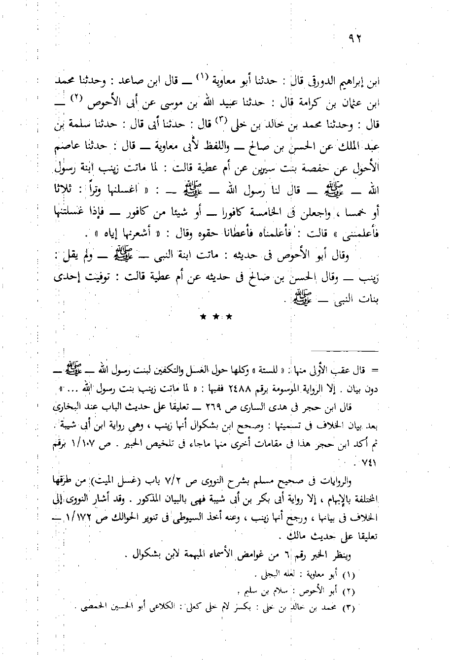 ابن إِبْرَاهِيمَ الدَّوْرَقِيُّ قَالَ: حَدَّثَنَا أَبُو مُعَاوِيَةَ - قَالَ ابْنُ صَاعِدٍ: وَحَدَّثَنَا محمد ابن عُثْمَانَ بْنِ كَرَامَةَ قَالَ: حَدَّثَنَا عُبَيْدُ اللَّهِ بْنُ مُوسَى عن أَبِي الأَحْوَصِ - قَالَ: وَحَدَّثَنَا مُحَمَّدُ بْنُ خَالِدِ بْنِ خَلِيٍّ قَالَ: حَدَّثَنَا أَبِي قَالَ: حَدَّثَنَا سَلَمَةُ بْنُ عَبْدِ الْمَلِكِ عَنِ الْحَسَنِ بْنِ صَالِحٍ - وَاللَّفْظُ لأَبِي مُعَاوِيَةَ - قَالَ: حَدَّثَنَا عَاصِمٌ 5 الأَحْوَلُ عَنْ حَفْصَةَ بِنْتِ سِيرِينَ عَنْ أُمِّ عَطِيَّةَ قَالَتْ: لَمَّا مَاتَتْ زَيْنَبُ ابْنَةُ رَسُولِ اللَّهِ - صَلَّى اللَّهُ عَلَيْهِ وَسَلَّم َ - قَالَ لَنَا رَسُولُ اللَّهِ - صَلَّى اللَّهُ عَلَيْهِ وَسَلَّم َ -: " اغْسِلْنَهَا وِتْرًا: ثَلاثًا أَوْ خَمْسًا، وَاجْعَلْنَ فِي الْخَامِسَةِ كَافُورًا - أَوْ شَيْئًا مِنْ كَافُورٍ - فَإِذَا غَسَّلْتُنَّهَا فَأَعْلِمْنَنِي " قَالَتْ: فَأَعْلَمْنَاهُ فَأَعْطَانَا حِقْوَهُ وَقَالَ: " أَشْعِرْنَهَا إِيَّاهُ ".
