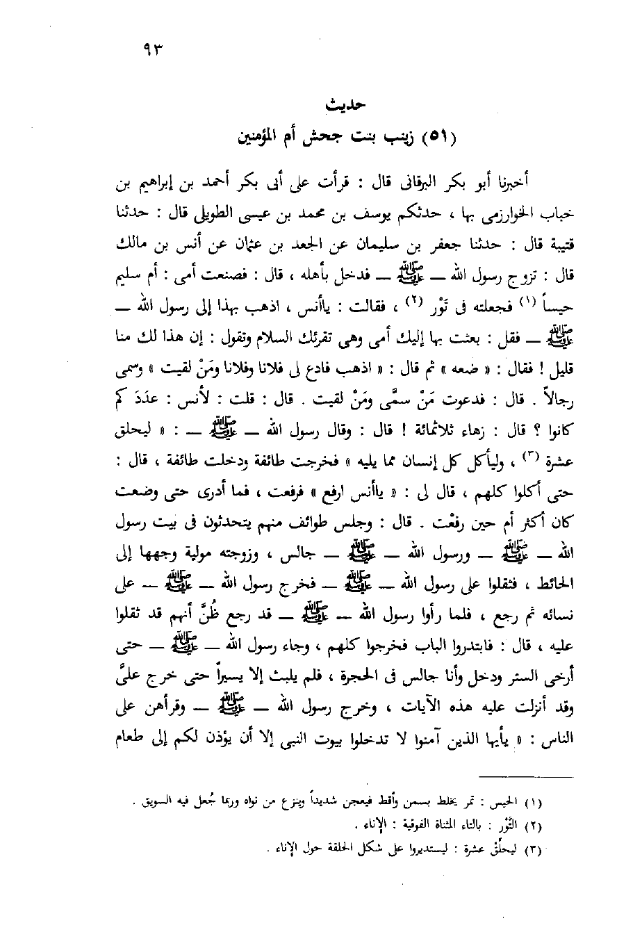 أَخْبَرَنَا أَبُو بَكْرٍ الْبَرْقَانِيُّ قَالَ: قَرَأْتُ عَلَى أَبِي بَكْرٍ أَحْمَدَ بْنِ إِبْرَاهِيمَ بْنِ خَبَّابٍ الْخُوَارَزْمِيِّ بِهَا، حَدَّثَكُمْ يُوسُفُ بْنُ مُحَمَّدِ بْنِ عِيسَى الطَّوِيلِيُّ قَالَ: حَدَّثَنَا قُتَيْبَةُ قَالَ: حَدَّثَنَا جَعْفَرُ بْنُ سُلَيْمَانَ عَنِ الْجَعْدِ بْنِ عُثْمَانَ عَنْ أَنَسِ بْنِ مَالِكٍ قَالَ: تَزَوَّجَ رَسُولُ اللَّهِ - صَلَّى اللَّهُ عَلَيْهِ وَسَلَّم َ - فَدَخَلَ بِأَهْلِهِ، قَالَ: فَصَنَعَتْ أُمِّي: أُمُّ سُلَيْمٍ حَيْسًا فَجَعَلَتْهُ فِي تَوْرٍ، فَقَالَتْ: يَا أَنَسُ، اذْهَبْ بِهَذَا إِلَى رَسُولِ اللَّهِ - صَلَّى اللَّهُ عَلَيْهِ وَسَلَّم َ - فَقُلْ: بَعَثَتْ بِهَا إِلَيْكَ أُمِّي وهي تقرئك السَّلامَ وَتَقُولُ: إِنَّ هَذَا لَكَ منا قَلِيلٌ {فَقَالَ: " ضَعْهُ " ثُمَّ قَالَ: " اذْهَبْ فَادْعُ لِي فُلانًا وَفُلانًا وَمَنْ لَقِيتَ " وَسَمَّى رِجَالا. قَالَ: فَدَعَوْتُ مَنْ سَمَّى وَمَنْ لَقِيتُ. قَالَ: قُلْتُ: لأَنَسٍ: عَدَدُ كَمْ كانوا؟ قال: زهاء ثلاثمائة} قَالَ: وَقَالَ رَسُولُ اللَّهِ - صَلَّى اللَّهُ عَلَيْهِ وَسَلَّم َ -: " لِيُحَلِّقْ عَشْرَةٌ، وَلْيَأْكُلْ كُلُّ إِنْسَانٍ مِمَّا يَلِيهِ " فَخَرَجَتْ طَائِفَةٌ وَدَخَلَتْ طَائِفَةٌ، قَالَ: حَتَّى أَكَلُوا كُلُّهُمْ، قَالَ لِي: " يَا أَنَسُ ارْفَعْ " فَرَفَعْتُ، فَمَا أَدْرِي حَتَّى وَضَعْتُ كَانَ أَكْثَرَ أَمْ حِينَ رَفَعْتُ. قَالَ: وَجَلَسَ طَوَائِفُ مِنْهُمْ يَتَحَدَّثُونَ فِي بَيْتِ رَسُولِ اللَّهِ - صَلَّى اللَّهُ عَلَيْهِ وَسَلَّم َ - وَرَسُولُ اللَّهِ - صَلَّى اللَّهُ عَلَيْهِ وَسَلَّم َ - جَالِسٌ، وَزَوْجَتُهُ مُوَلِّيَةٌ وَجْهَهَا إِلَى الْحَائِطِ، فَثَقُلُوا عَلَى رَسُولِ اللَّهِ - صَلَّى اللَّهُ عَلَيْهِ وَسَلَّم َ - فَخَرَجَ رَسُولُ اللَّهِ - صَلَّى اللَّهُ عَلَيْهِ وَسَلَّم َ - عَلَى نِسَائِهِ ثُمَّ رَجَعَ، فَلَمَّا رَأَوْا رَسُولَ اللَّهِ - صَلَّى اللَّهُ عَلَيْهِ وَسَلَّم َ - قد رجع ظن أَنَّهُمْ قَدْ ثَقُلُوا عَلَيْهِ، قَالَ: فَابْتَدَرُوا الْبَابَ فَخَرَجُوا كُلُّهُمْ، وَجَاءَ رَسُولُ اللَّهِ - صَلَّى اللَّهُ عَلَيْهِ وَسَلَّم َ - حَتَّى أَرْخَى السِّتْرَ وَدَخَلَ وَأَنَا جَالِسٌ فِي الْحُجْرَةِ، فَلَمْ يَلْبَثْ إِلا يَسِيرًا حَتَّى خَرَجَ عَلَيَّ وَقَدْ أُنْزِلَتْ عَلَيْهِ هَذِهِ الآيَاتُ، وَخَرَجَ رَسُولُ اللَّهِ - صَلَّى اللَّهُ عَلَيْهِ وَسَلَّم َ - وَقَرَأَهُنَّ عَلَى النَّاسِ: {يَأَيُّهَا الَّذِينَ آمَنُوا لا تَدْخُلُوا بُيُوتَ النَّبِيِّ إِلا أَنْ يُؤْذَنَ لَكُمْ إِلَى طعام
