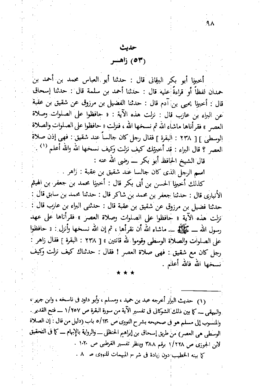 أَخْبَرَنَا أَبُو بَكْرٍ الْبَرْقَانِيُّ قَالَ: حَدَّثَنَا أَبُو الْعَبَّاسِ مُحَمَّدُ بْنُ أَحْمَدَ بْنِ حَمْدَانَ لَفْظًا أَوْ قِرَاءَةً عَلَيْهِ قَالَ: حَدَّثَنَا أَحْمَدُ بْنُ سَلَمَةَ قَالَ: حَدَّثَنَا إِسْحَاقُ قَالَ: أَخْبَرَنَا يَحْيَى بْنُ آدَمَ قَالَ: حَدَّثَنَا الْفُضَيْلُ بْنُ مَرْزُوقٍ عَنْ شَقِيقِ بْنِ عُقْبَةَ عَنِ الْبَرَاءِ بْنِ عَازِبٍ قَالَ: نَزَلَتْ هَذِهِ الآيَةُ: " حَافِظُوا عَلَى الصَّلَوَاتِ وصلاة الْعَصْرِ " فَقَرَأْنَاهَا مَا شَاءَ اللَّهُ ثُمَّ نَسَخَهَا اللَّهُ، فَنَزَلَتْ {حَافِظُوا عَلَى الصَّلَوَاتِ وَالصَّلاةِ الْوُسْطَى} [238: البقرة] فَقَالَ رَجُلٌ كَانَ جَالِسًا عِنْدَ شَقِيقٍ: فَهِيَ إِذَنْ صَلاةُ الْعَصْرِ؟ قَالَ الْبَرَاءُ: قَدْ أَخْبَرْتُكَ كَيْفَ نَزَلَتْ وَكَيْفَ نَسَخَهَا اللَّهُ وَاللَّهُ أَعْلَمُ.