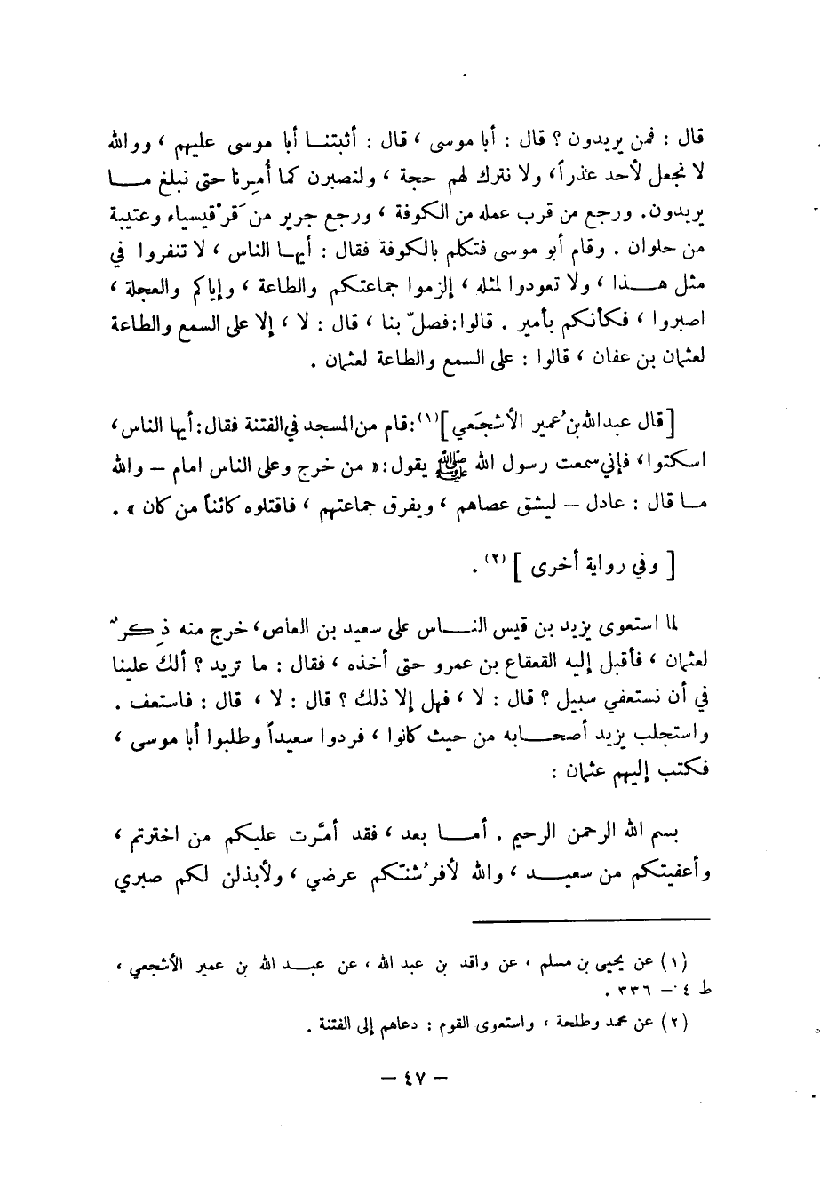 قال: فمن يريدون؟ قال: أبا موسى قال: أثبتنا أبا موسى عليهم ووالله لا نجعل لأحد عذرا ولا نترك لهم حجة ولنصبرن كما أمرنا حتى نبلغ ما يريدون ورجع من قرب عمله من الكوفة ورجع جرير من قرقيسياء وعتيبة من حلوان وقام أبو موسى فتكلم بالكوفة فقال: أيها الناس لا تنفروا في مثل هذا ولا تعودوا لمثله إلزموا جماعتكم والطاعة وإياكم والعجلة اصبروا فكأنكم بأمير قالوا: فصل بنا قال: لا إلا على السمع والطاعة لعثمان بن عفان قالوا: على السمع والطاعة لعثمان.