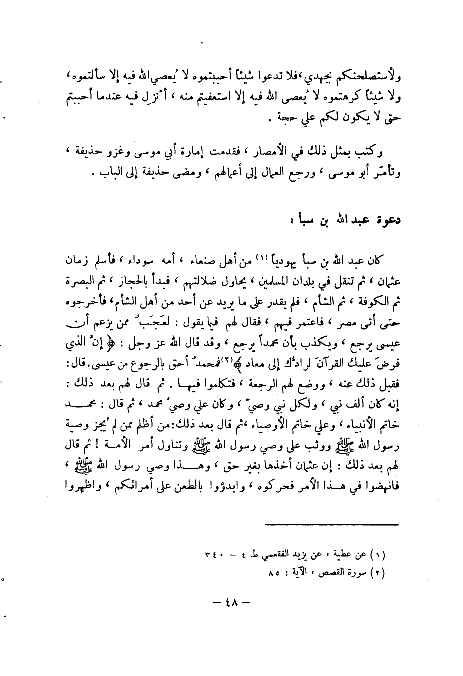 كان عبد الله بن سبأ يهوديا1 من أهل صنعاء أمه سوداء فأسلم زمان عثمان ثم تنقل في بلدان المسلمين يحاول ضلالتهم فبدأ بالحجاز ثم البصرة ثم الكوفة ثم الشام فلم يقدر على ما يريد عن أحد من أهل الشام فأخرجوه حتى أتى مصر فاعتمر فيهم فقال لهم فيما يقول: لعجب ممن يزعم أن عيسى يرجع ويكذب بأن محمدا يرجع وقد قال الله عز وجل: {إِنَّ الَّذِي فَرَضَ عَلَيْكَ الْقُرْآنَ لَرَادُّكَ إِلَى مَعَادٍ} 2 فمحمد أحق بالرجوع من عيسى قال: فقبل ذلك عنه ووضع لهم الرجعة فتكلموا فيها ثم قال لهم بعد ذلك: إنه كان ألف نبي ولكل نبي وصي وكان علي وصى محمد ثم قال: محمد خاتم الانبياء وعلى خاتم الأوصياء ثم قال بعد ذلك: من أظلم ممن لم يجز وصية رسول الله صلى الله عليه وسلم ووثب على وصي رسول الله صلى الله عليه وسلم وتناول أمر الأمة ثم قال لهم بعد ذلك: إن عثمان أخذها بغير حق وهذا وصي رسول الله صلى الله عليه وسلم فانهضوا في هذا الأمر فحركوه وابدؤوا بالطعن على أمرائكم واظهروا