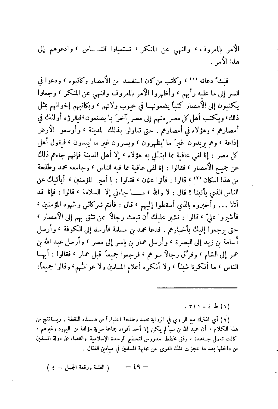 2 - أي اشتراك مع الراوي في الرواية محمد وطلحة اعتبارا من هذه النقطة. ويستنتج من هذا الكلام, أن عبد الله بن سبأ لم يكن إلا أحد أفراد جماعة سرية مؤلفة من اليهود وغيرهم. كانت تعمل جاهدة وفق مخطط مدروس لتحطيم الوحدة الإسلامية والقضاء على دولة المسلمين من داخلها بعد ما عجزت تلك القوى عن مجابهة المسلمين في ميادين القتال.