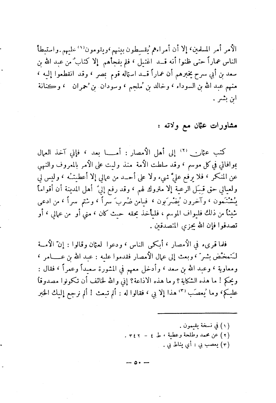 فلما قرئ في الأمصار ابكى الناس ودعوا لعثمان وقالوا: إن الأمة لتمخض بشر وبعث إلى عمال الأمصار فقدموا عليه: عبد الله بن عامر ومعاوية وعبد الله بن سعد وأدخل معهم في المشورة سعيدا وعمرا فقال: ويحكم! ما هذه الشكاية؟ وما هذه الاذاعة؟ إني والله لخائف أن تكونوا مصدوقا عليكم وما يعصب3 هذا إلا بي فقالوا: له: ألم تبعث! ألم نرجع إليك الخبر