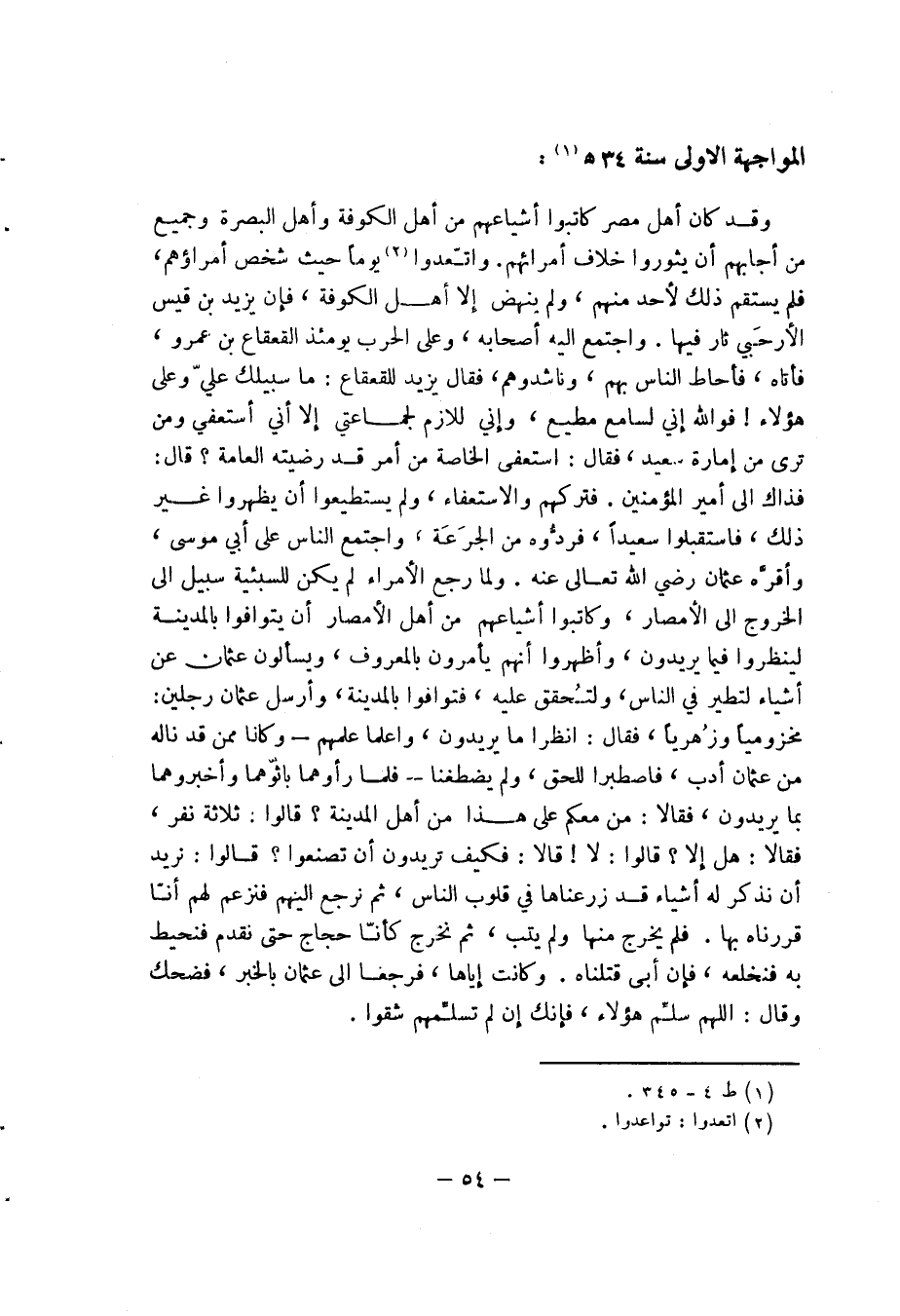 وقد كان أهل مصر كاتبوا أشياعهم من أهل الكوفة وأهل البصرة وجميع من أجابهم أن يثوروا خلاف أمرائهم واتعدوا2 يوما حيث شخص أمراؤهم, فلم يستقم ذلك لأحد منهم ولم ينهض إلا أهل الكوفة فإن يزيد بن قيس الأرحبي ثار فيها واجتمع إليه أصحابه وعلى الحرب يومئذ القعقاع بن عمرو فأتاه فأحاط الناس بهم وناشدوهم فقال يزيد للقعقاع: ما سبيلك علي وعلى هؤلاء فوالله إني لسامع مطيع وإني للازم لجماعتي إلا أني أستعفي ومن ترى من إمارة سعيد فقال: استعفى الخاصة من أمر قد رضيته العامة؟ قال: فذاك إلى أمير المؤمنين فتركهم والاستعفاء ولم يستطيعوا أن يظهروا غير ذلك فاستقبلوا سعيدا فردوه من الجرعة واجتمع الناس على أبي موسى وأقره عثمان رضي الله تعالى عنه ولما رجع الأمراء لم يكن للسبئية سبيل إلى الخروج إلى الأمصار وكاتبوا أشياعهم من أهل الأمصار أن يتوافوا بالمدينة لينظروا فيما يريدون وأظهروا أنهم يأمرون بالمعروف ويسألون عثمان عن أشياء لتطير في الناس ولتحقق عليه فتوافوا بالمدينة وأرسل عثمان رجلين: مخزوميا وزهريا فقال: انظرا ما يريدون واعلما علمهم - وكانا ممن قد ناله من عثمان أدب فاصطبرا للحق ولم يضطغنا - فلما رأوهما باثوهما وأخبروهما بما يريدون فقالا:: من معكم على هذا من أهل المدينة؟ قالوا: ثلاثة نفر فقالا:: هل إلا؟ قالوا: لا قالا:: فكيف تريدون أن تصنعوا؟ قالوا: نريد أن نذكر له أشياء قد زرعناها في قلوب الناس ثم نرجع إليهم فنزعم لهم أنا قررناه بها فلم يخرج منها ولم يتب ثم نخرج كأنا حجاج حتى نقدم فنحيط به فنخلعه فإن أبى قتلناه وكانت إياها فرجعا إلى عثمان بالخبر فضحك وقال: اللهم سلم هؤلاء فإنك أن لم تسلمهم شقوا.