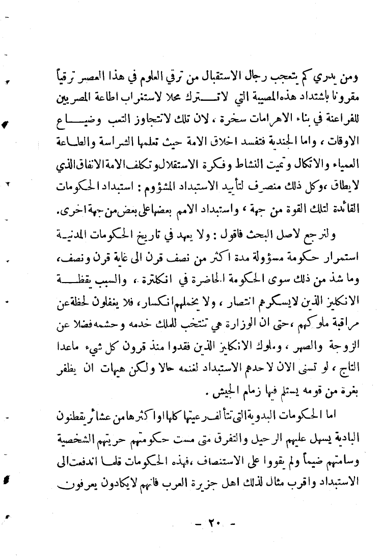 ومن يدري كم يتعجب رجال الاستقبال من تَرَقِّي العلوم في هذا العصر ترقِّياً مقروناً باشتداد هذه المصيبة التي لا تترك محلاً لاستغراب إطاعة المصريين للفراعنة في بناء الأهرامات سخرة؛ لأنَّ تلك لا تتجاوز التّعب وضياع الأوقات، وأمّا الجندية فتُفسد أخلاق الأمّة؛ حيثُ تُعلِّمها الشّراسة والطّاعة العمياء والاتِّكال، وتُميت النّشاط وفكرة الاستقلال، وتُكلِّف الأمّة الإنفاق الذي لا يطاق؛ وكُلُّ ذلك منصرف لتأييد الاستبداد المشؤوم: استبداد الحكومات القائدة لتلك القوَّة من جهة، واستبداد الأمم بعضها على بعض من جهة أخرى.