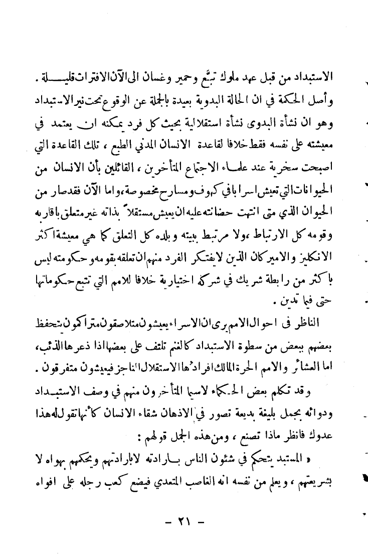 الاستبداد من قبل عهد ملوك تبّع وحُميْر وغسان إلى الآن إلاّ فترات قليلة. وأصل الحكمة في أنَّ الحالة البدوية بعيدة بالجملة عن الوقوع تحت نير الاستبداد، وهو أنَّ نشأة البدويّ نشأة استقلالية؛ بحيث كلُّ فرد يمكنه أنْ يعتمد في معيشته على نفسه فقط، خلافاً لقاعدة الإنسان المدنيّ الطبع، تلك القاعدة التي أصبحت سخرية عند علماء الاجتماع المتأخِّرين، القائلين بأنَّ الإنسان من الحيوانات التي تعيش أسراباً في كهوف ومسارح مخصوصة، وأمّا الآن فقد صار من الحيوان الذي متى انتهت حضانته؛ عليه أنْ يعيش مستقلاً بذاته، غير متعلّق بأقاربه وقومه كلّ الارتباط، ولا مرتبط ببيته وبلده كلّ التّعلُّق، كما هي معيشة أكثر الإنكليز والأمريكان الذين يفتكر الفرد منهم أنَّ تعلُّقه بقومه وحكومته ليس بأكثر من رابطة شريك في شركة اختيارية، خلافاً للأمم التي تتبع حكوماتها حتى فيما تدين.