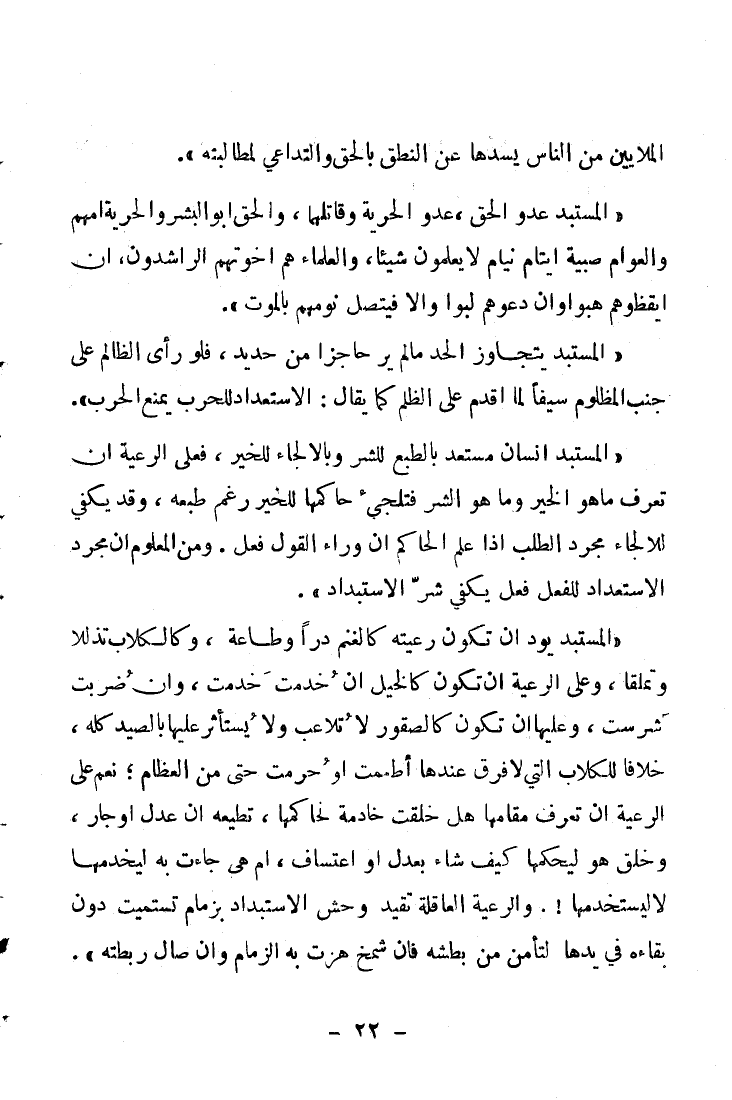 «المستبدّ: يودُّ أنْ تكون رعيته كالغنم درّاً وطاعةً، وكالكلاب تذلُّلاً وتملُّقاً، وعلى الرَّعية أنْ تكون كالخيل إنْ خُدِمَت خَدمتْ، وإنْ ضُرِبت شَرست، وعليها أن تكون كالصقور لا تُلاعب ولا يُستأثر عليها بالصّيد كلِّه، خلافاً للكلاب التي لا فرق عندها أَطُعِمت أو حُرِمت حتَّى من العظام. نعم؛ على الرّعية أن تعرف مقامها: هل خُلِقت خادمة لحاكمها، تطيعه إنْ عدل أو جار، وخُلق هو ليحكمها كيف شاء بعدل أو اعتساف؟ أم هي جاءت به ليخدمها لا يستخدمها؟ .. والرَّعية العاقلة تقيَّد وحش الاستبداد بزمام تستميت دون بقائه في يدها؛ لتأمن من بطشه، فإن شمخ هزَّت به الزّمام وإنْ صال ربطتْه».