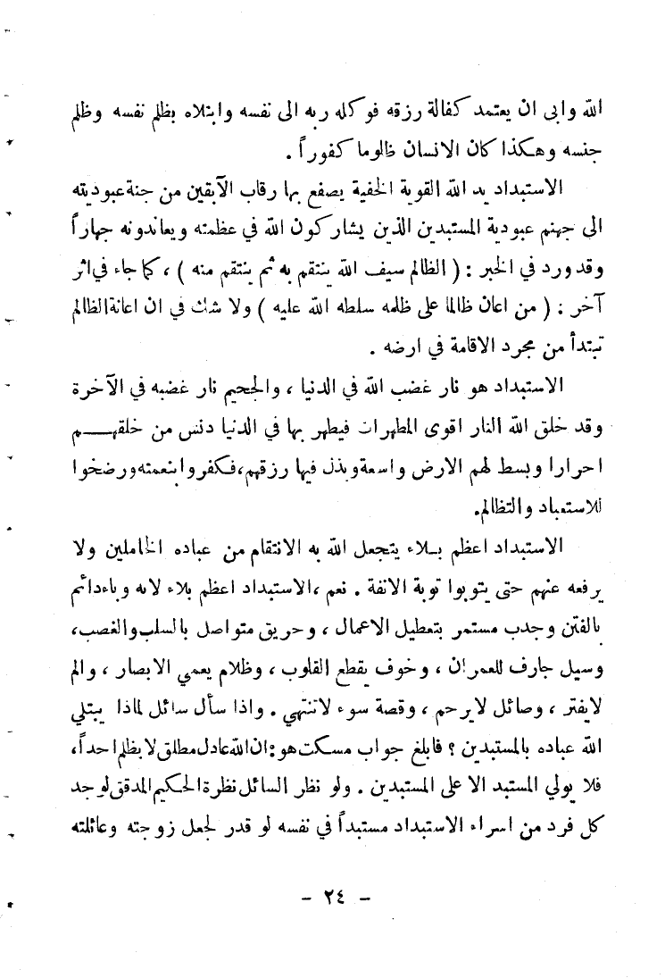 الاستبداد: يَدُ الله القويّة الخفيّة يصفعُ بها رقاب الآبقين من جنّة عبوديَّته إلى جهنَّم عبودية المستبدِّين الذين يشاركون الله في عظمته ويعاندونه جهاراً، وقد ورد في الخبر: «الظّالم سيف الله ينتقم به، ثمَّ ينتقم منه»، كما جاء في أثرٍ آخر: «مَنْ أعان ظالماً على ظلمه سَلَّطَه الله عليه»، ولا شكَّ في أنَّ إعانة الظّالم تبتدئ من مجرَّد الإقامة على أرضه.