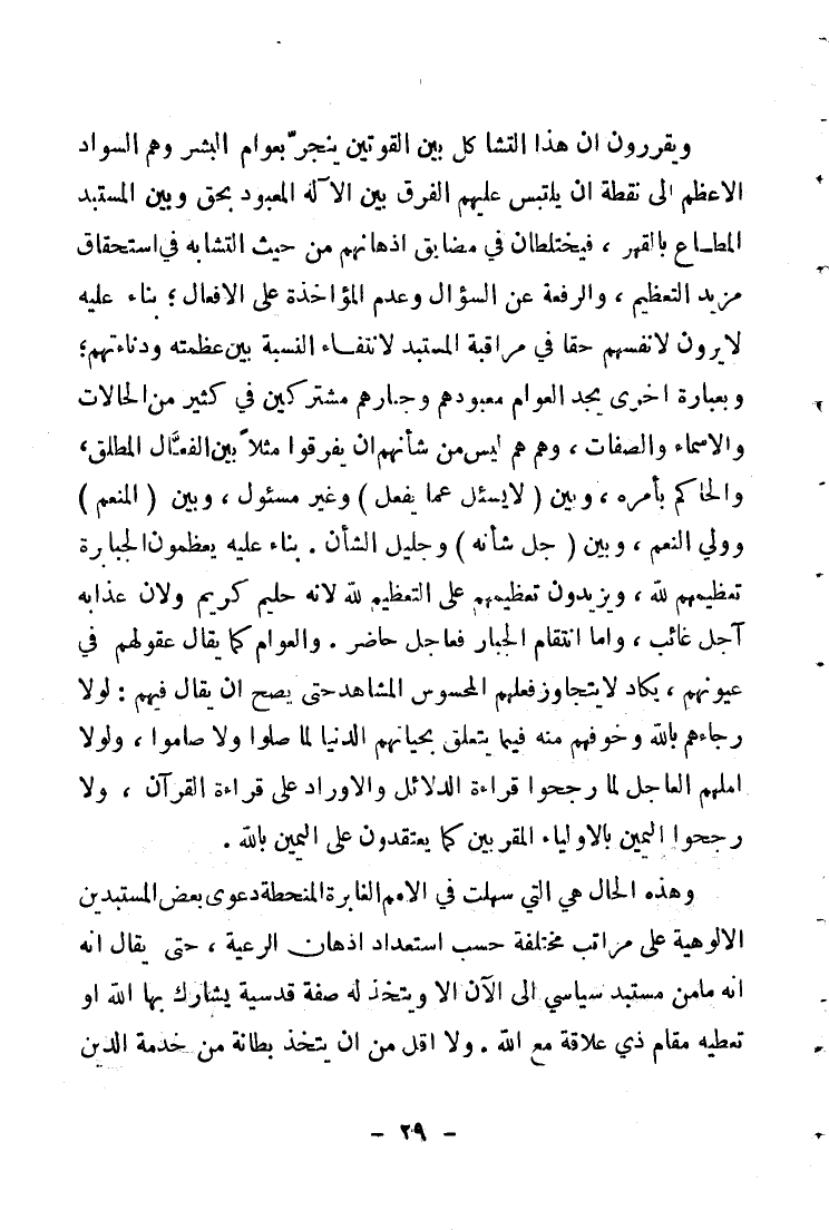 ويُقرِّرون أنَّ هذا التَّشاكل بين القوّتَيْن ينجرُّ بعوام البشر- وهم السواد الأعظم - إلى نقطة أنْ يلتبس عليهم الفرق بين الإله المعبود بحقّ وبين المستبدّ المُطاع بالقهر، فيختلطان في مضايق أذهانهم من حيث التَّشابه في استحقاق مزيد التَّعظيم، والرِّفعة عن السّؤال وعدم المؤاخذة على الأفعال؛ بناءً عليه؛ لا يرون لأنفسهم حقّاً في مراقبة المستبدّ لانتفاء النّسبة بين عظمته ودناءتهم؛ وبعبارة أخرى: يجد العوام معبودهم وجبَّارهم مشتركَيْنِ في كثيرٍ من الحالات والأسماء والصِّفات، وهم ليس من شأنهم أنْ يُفرِّقوا مثلاً بين (الفعَّال المطلق)، والحاكم بأمره، وبين (لا يُسأل عمّا يفعل) وغير مسؤول، وبين ... (المنعم) ووليّ النعم، وبين (جلَّ شأنه) وجليل الشَّأن. بناءً عليه؛ يُعظِّمون الجبابرة تعظيمهم لله، ويزيدون تعظيمهم على التَّعظيم لله؛ لأنَّه حليمٌ كريم، ولأنَّ عذابه آجلٌ غائبٌ، وأمَّا انتقام الجبَّار فعاجلٌ حاضر. والعوام - كما يقال - عقولهم في عيونهم، يكاد لا يتجاوز فعلهم المحسوس المُشاهَد، حتَّى يصحّ أنْ يُقال فيهم: لولا رجاؤهم بالله، وخوفهم منه فيما يتعلَّق بحياتهم الدّنيا، لما صلّوا ولا صاموا، ولولا أملهم العاجل، لما رجَّحوا قراءة الدّلائل والأوراد على قراءة القرآن، ولا رجَّحوا اليمين بالأولياء - المقرَّبين كما يعتقدون - على اليمين بالله.