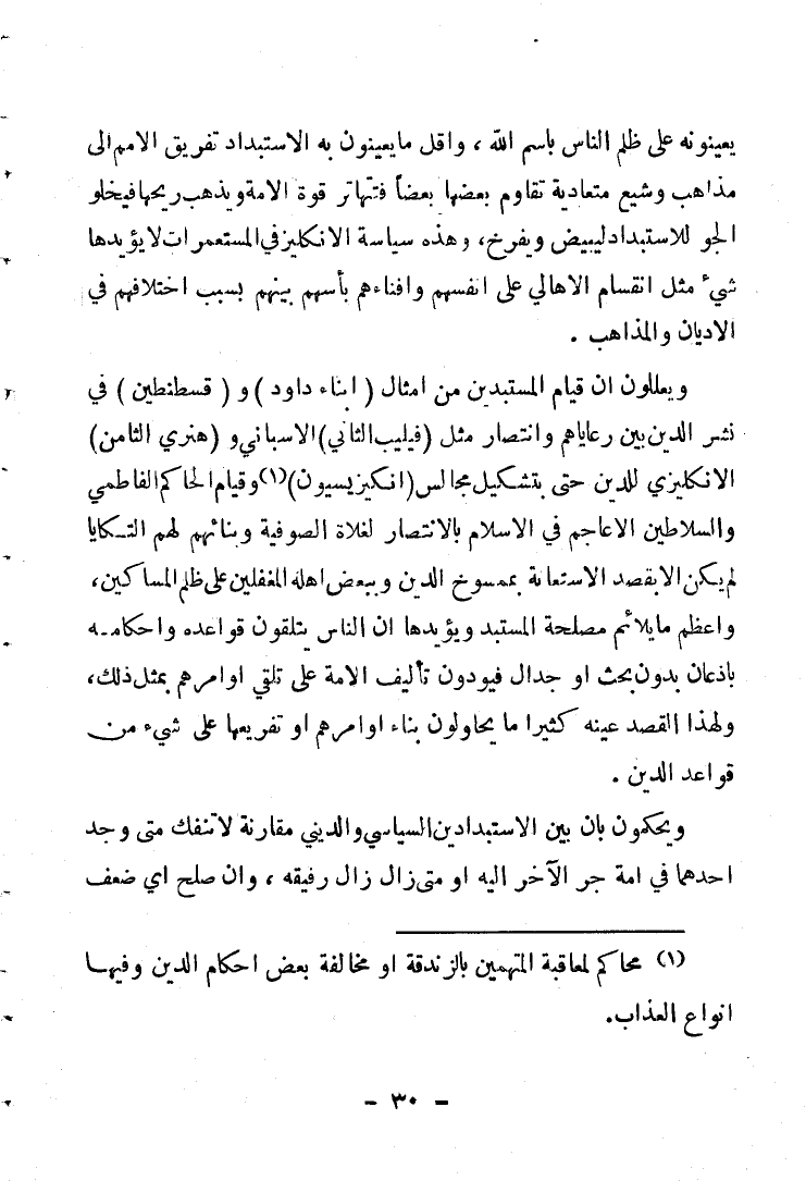 يعينونه على ظلم النَّاس باسم الله، وأقلُّ ما يعينون به الاستبداد، تفريق الأمم إلى مذاهب وشيع متعادية تقاوم بعضها بعضاً، فتتهاتر قوَّة الأمّة ويذهب ريحها، فيخلو الجوّ للاستبداد ليبيض ويُفرِّخ، وهذه سياسة الإنكليز في المستعمرات، لا يُؤيِّدها شيء مثل انقسام الأهالي على أنفسهم، وإفنائهم بأسهم بينهم بسبب اختلافهم في الأديان والمذاهب.