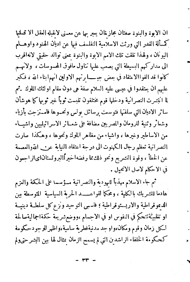 أنَّ الأبوّة والبنوّة صفتان مجازيَّتان يُعبَّر بهما عن معنى لا يقبله العقل إلا تسليماً؛ كمسألة القدر التي ورثت الإسلامية التّفلسف فيها عن أديان اليهود وأوهام اليونان. ولهذا؛ تلقَّت تلك الأمم الأبوّة والبنوّة بمعنى توالد حقيقيّ؛ لأنّه أقرب إلى مداركهم البسيطة التي يصعب عليها تناول ما فوق المحسوسات، ولأنّهم كانوا قد ألفوا الاعتقاد في بعض جبابرتهم الأوّلين أنَّهم أبناء الله، فكَبُرَ عليهم أنْ يعتقدوا في موسى عليه السّلام صفة هي دون مقام أولئك الملوك. ثمَّ لمّا انتشرت النّصرانية ودخلها أقوام مختلفون، تلبَّست ثوباً غير ثوبها، كما سائر الأديان التي سلفتها، فتوسَّعت برسائل بولس ونحوها، فامتزجت بأزياء وشعائر وثنية للرُّومان والمصريين مُضافة على شعائر الإسرائيليين وأشياء من الأساطير وغيرها، وأشياء من مظاهر الملوك ونحوها. وهكذا صارت النّصرانية تُعظِّم رجال الكهنوت إلى درجة اعتقاد النّيابة عن الله والعصمة عن الخطأ وقوَّة التَّشريع، ونحو ذلك ممّا رفضه أخيراً البروتستان؛ أي الرّاجعون في الأحكام لأصل الإنجيل.