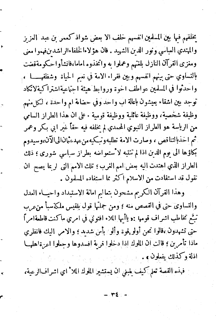 يخلفهم فيها بين المسلمين أنفسهم خلف؛ إلا بعض شواذ؛ كعمر بن عبد العزيز والمهتدي العبّاسيّ ونور الدّين الشّهيد. فإنَّ هؤلاء الخلفاء الرّاشدين فهموا معنى ومغزى القرآن النّازل بلغتهم، وعملوا به واتَّخذوه إماماً، فأنشؤوا حكومة قضَتْ بالتّساوي حتَّى بينهم أنفسهم وبين فقراء الأمّة في نعيم الحياة وشظفها، وأحدثوا في المسلمين عواطف أخوة وروابط هيئة اجتماعية اشتراكية لا تكاد توجد بين أشقاء يعيشون بإعالة أبٍ واحد وفي حضانة أمٍّ واحدة، لكُلٍّ منهم وظيفة شخصية، ووظيفة عائلية، ووظيفة قومية. على أنَّ هذا الطّراز السّامي من الرّياسة هو الطِّراز النّبوي المُحمَّدي الذي لم يخلفه فيه حقّاً غير أبي بكر وعمر، ثمَّ أخذ بالتّناقص، وصارت الأمّة تطلبه وتبكيه من عهد عثمان إلى الآن، وسيدوم بكاؤها إلى يوم الدِّين إذا لم تنتبه لاستعواضه بطراز سياسيّ شوريّ؛ ذلك الطّراز الذي اهتدت إليه بعض أمم الغرب؛ تلك الأمم التي، لربّما يصحُّ أنْ نقول، قد استفادت من الإسلام أكثر ممّا استفاده المسلمون.