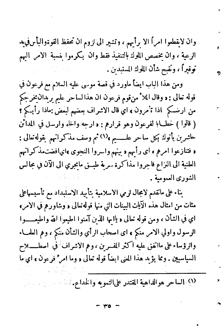 بناءً على ما تقدّم؛ لا مجال لرمي الإسلامية بتأييد الاستبداد مع تأسيسها على مئات الآيات البيِّنات التي منها قوله تعالى: {وشاورهم في الأمر}؛ أي في الشأن، ومن قوله تعالى: {يا أيها الذين آمنوا أطيعوا الله وأطيعوا الرسول وأولي الأمر منكم}؛ أي أصحاب الرأي والشأن منكم، وهم العلماء والرؤساء على ما اتَّفق عليه أكثر المفسِّرين، وهم الأشراف في اصطلاح السياسيين. ومما يؤيِّد هذا المعنى أيضاً قوله تعالى: {وما أمرُ فرعون}؛ أي ما