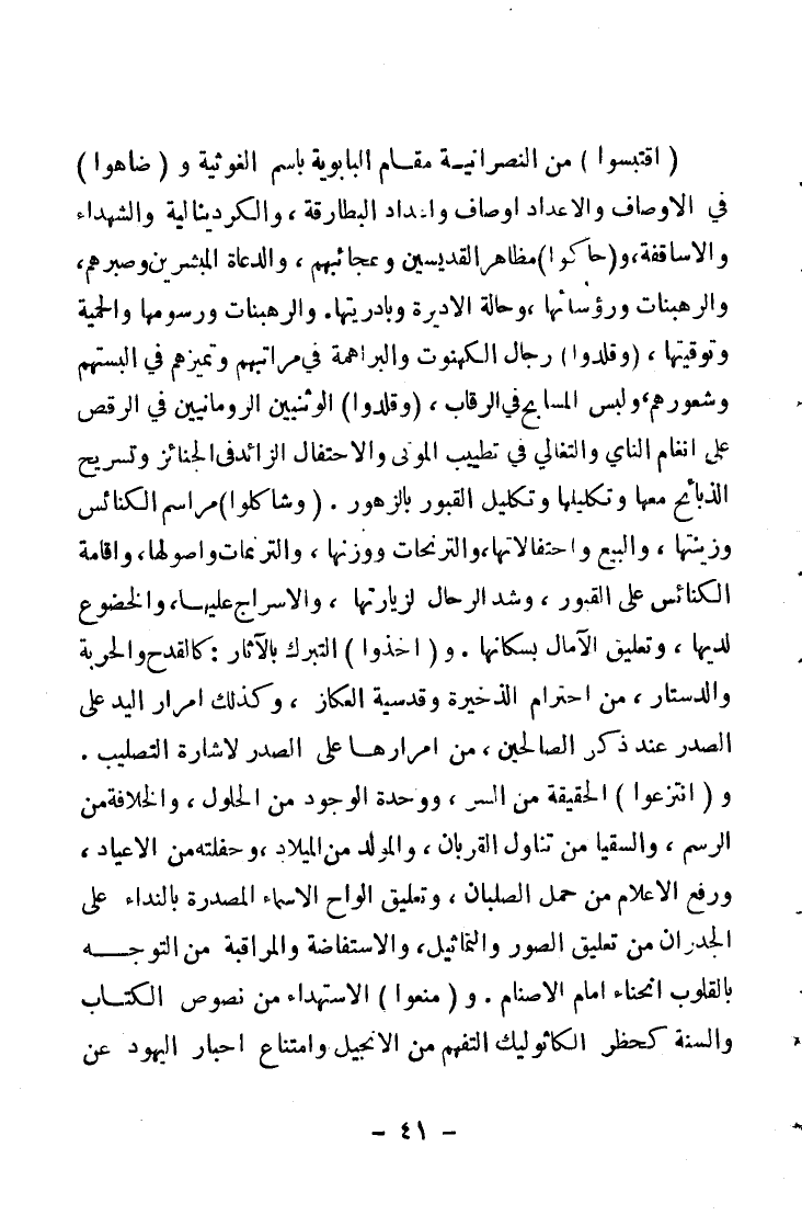 (اقتبسوا) من النصرانية مقام البابوية باسم الغوثية، و (ضاهوا) في الأوصاف والأعداد أوصاف وأعداد البطارقة، والكردينالية والشهداء والأساقفة، و (حاكوا) مظاهر القديسين وعجائبهم، والدعاة المبشّرين وصبرهم، والرّهبنات ورؤسائها، وحالة الأديرة وبادريتها. والرهبنات ورسومها والحميَّة وتوقيتها، و (قلّدوا) الوثنيين الرومانيين في الرّقص على أنغام الناي والتغالي في تطييب الموتى والاحتفال الزائد في الجنائز وتسريح الذبائح معها، وتكليلها وتكليل القبور بالزهور. و (شاكلوا) مراسم الكنائس وزينتها، والبِيَع واحتفالاتها، والترنّحات ووزنها، والترنُّمات وأصولها، وإقامة الكنائس على القبور، وشدّ الرِّحال لزيارتها، والإسراج عليها، والخضوع لديها، وتعليق الآمال بسكانها. و (أخذوا) التبرّك بالآثار: كالقدح والحربة والدستار، من احترام الذخيرة وقدسية العكاز، وكذلك إمرار اليد على الصّدر عند ذكر الصالحين، من إمرارها على الصدر لإشارة الصليب. و (انتزعوا) الحقيقة من السرّ، ووحدة الوجود من الحلول، والخلافة من الرّسم، والسّقيا من تناول القربان، والمولد من الميلاد، وحفلته من الأعياد، ورفع الأعلام من حمل الصلبان، وتعليق ألواح الأسماء المصدَّرة بالنّداء على الجدران من تعليق الصّور والتماثيل، والاستفاضة والمراقبة من التوجّه بالقلوب انحناءً أمام الأصنام. و (منعوا) الاستهداء من نصوص الكتاب والسُنَّة كحظر الكاثوليك التفهّم من الإنجيل، وامتناع أحبار اليهود عن