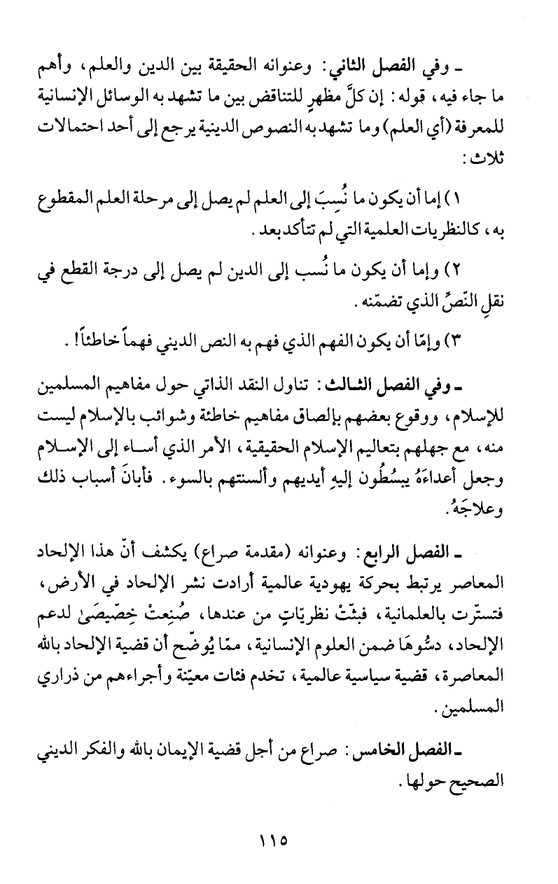 - وفي الفصل الثاني: وعنوانه الحقيقة بين الدين والعلم، وأهم
