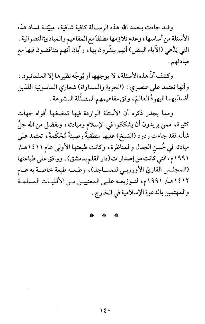 ا لأسئلة من اساسها، وعدم تلاؤمها مطلقأمع المفاهيم والمبادئ النصرانية.