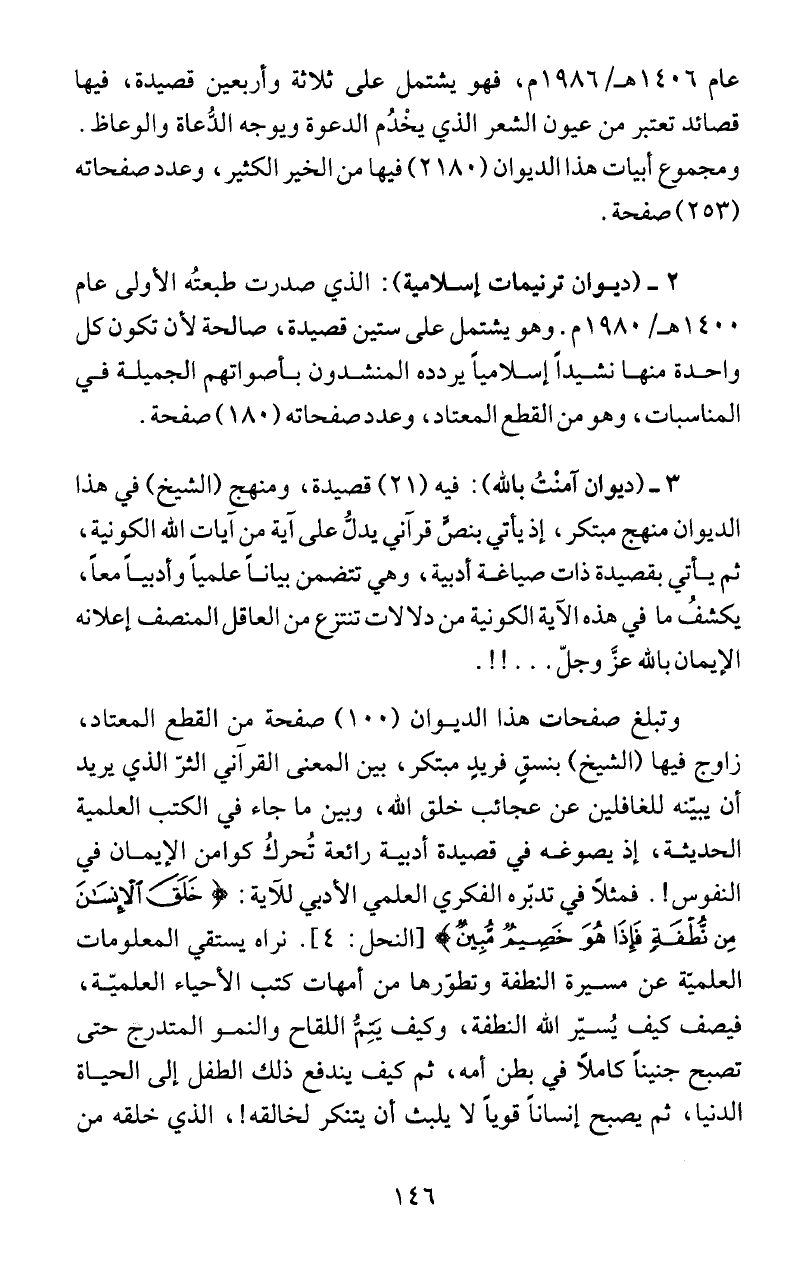 الديوان منهج مبتكر، إذ يأتي بنمق قوآني يدكُ على آية من ايات الله الكونية،
