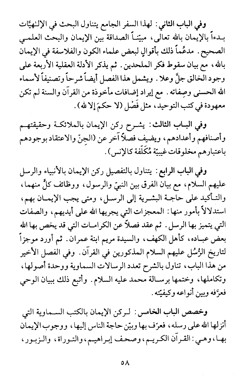 وفي الباب الرابع: يتناول بالتفصيل وكن الإيمان بالأنبياء والرسل